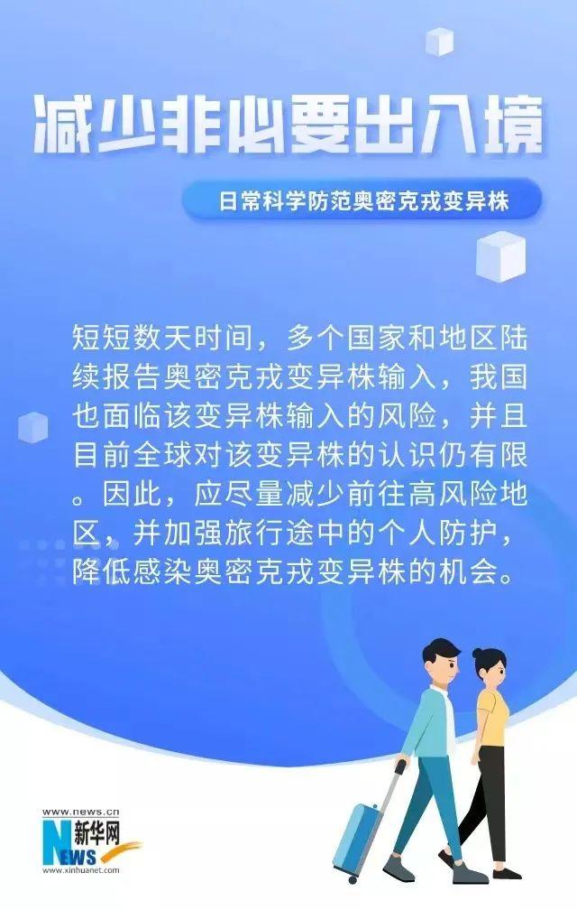 面对奥密克戎变异株公众在日常工作、生活中应如何做好防范?这七条关键提示不能忘内容来源 新华网编辑 郑嘉纯责任编辑 李倩如需转载,请注明以上内容