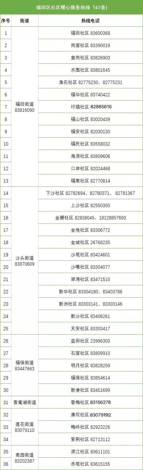 此外,福田区还开通了暖心服务热线,居民如遇到生活、就医等困难,可拨打福田区暖心服务热线 28813300 或拨打以下电话进行咨询——