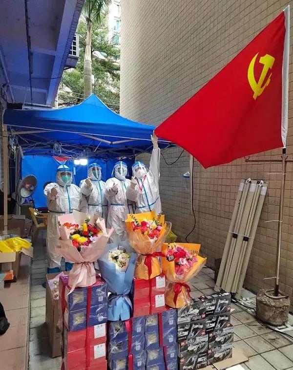 当天下午,一场特别的集体生日会在沙嘴村进行着。在沙头街道党工委的统筹安排、街道总工会的精心准备下,封控区临时党支部为处于“足不出户”居家隔离状态的居民举行生日会。党支部成员提前摸排居民的信息,发现有9名封控居民正好在2月生日,临时党支部便决定为他们订购鲜花和蛋糕,送上一场难忘的生日。