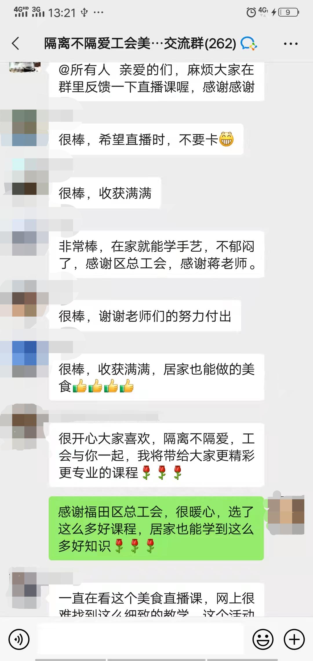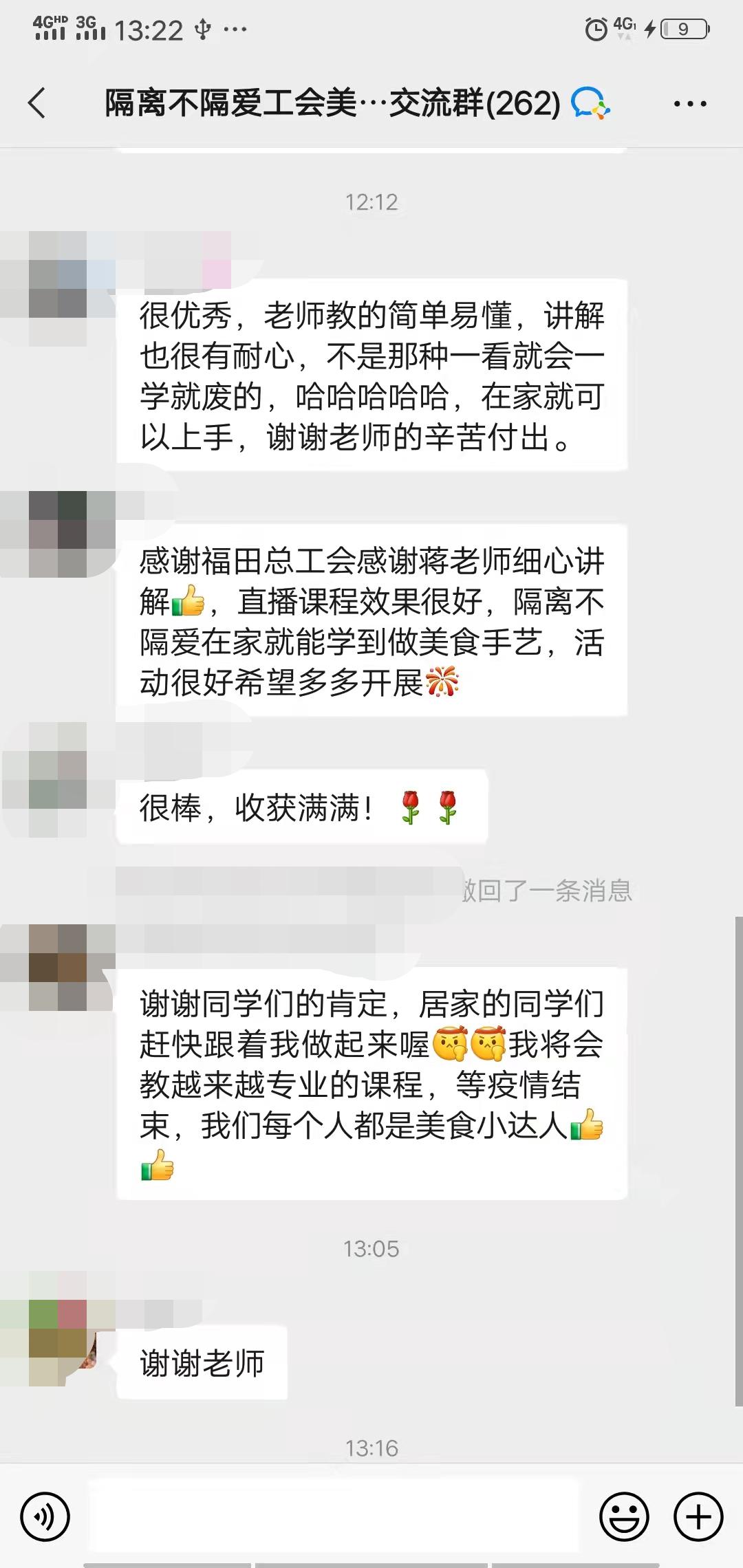 收到居民的反馈,绿景花园临时党支部书记、工会志愿者黄晓燕第一时间向福田区总工会反馈需求。隔离不隔爱,福田区总工会迅速组织,在舞蹈、烹饪的课程基础上持续推出书画、钢琴、声乐等线上直播课全方位满足不同群体的需求,丰富居家隔离居民的文娱生活,进一步做好防疫政策宣传、心理疏导工作。