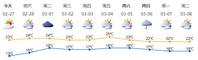 ●2月27日,晴天间多云,早晚有轻雾;气温13—23℃;东风2—3级;相对湿度55%—90%。2月28日至3月2日,云量增多,间中有零星小雨和轻雾;3月3日至4日多云,局地偶有零星小雨,早晚有轻雾。