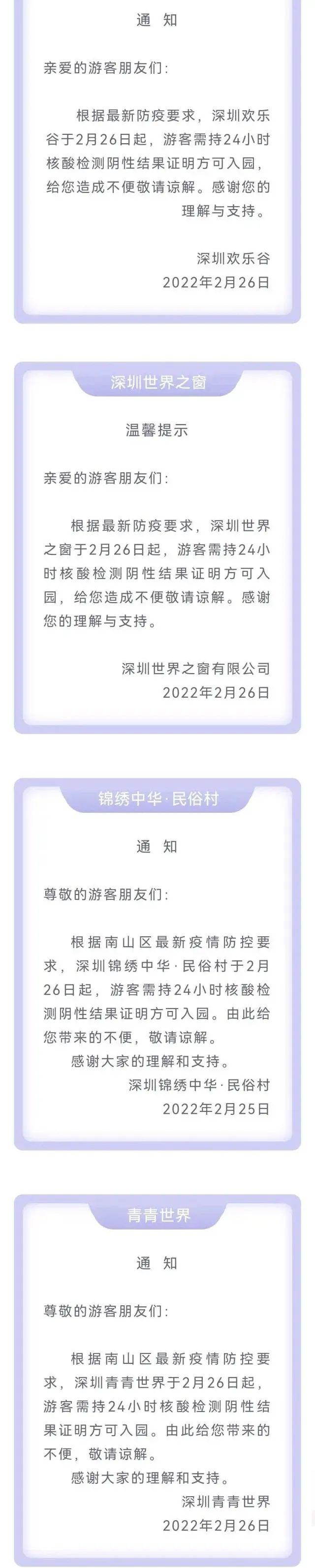 深圳市文化馆将暂停馆内各项线下活动和服务,数字文化馆线上服务正常开展,恢复开馆时间另行通知。此前,记者从欢乐谷、世界之窗锦绣中华民俗村多个景区获悉,目前进入深圳景区需要24小时核酸。