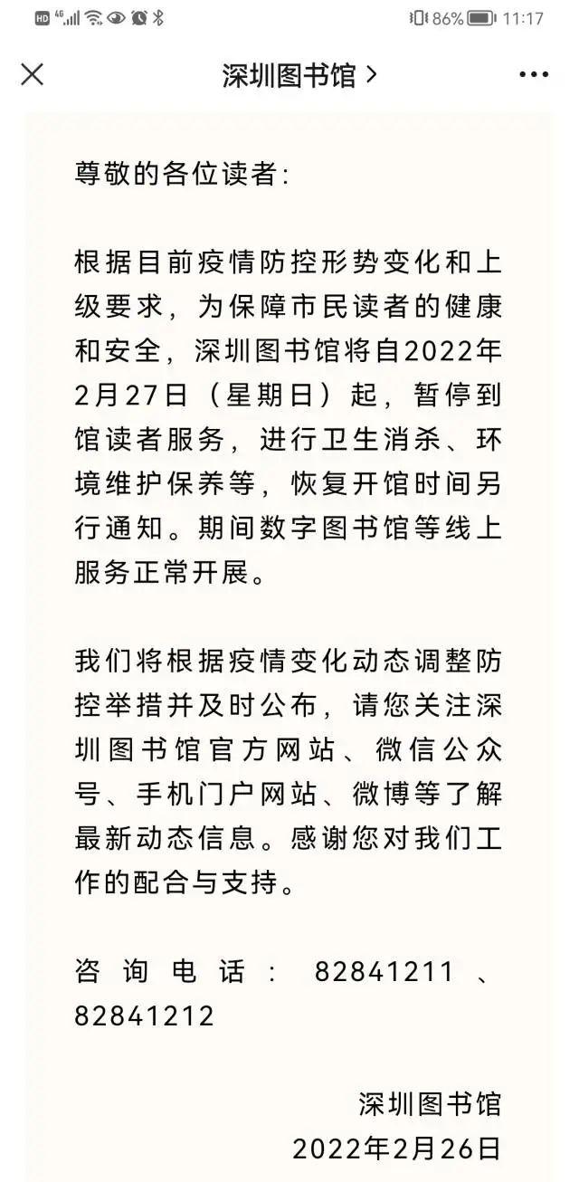 深圳图书馆将自2022年2月27日(星期日)起,暂停到馆读者服务,进行卫生消杀、环境维护保养等,恢复开馆时间另行通知。期间数字图书馆等线上服务正常开展。