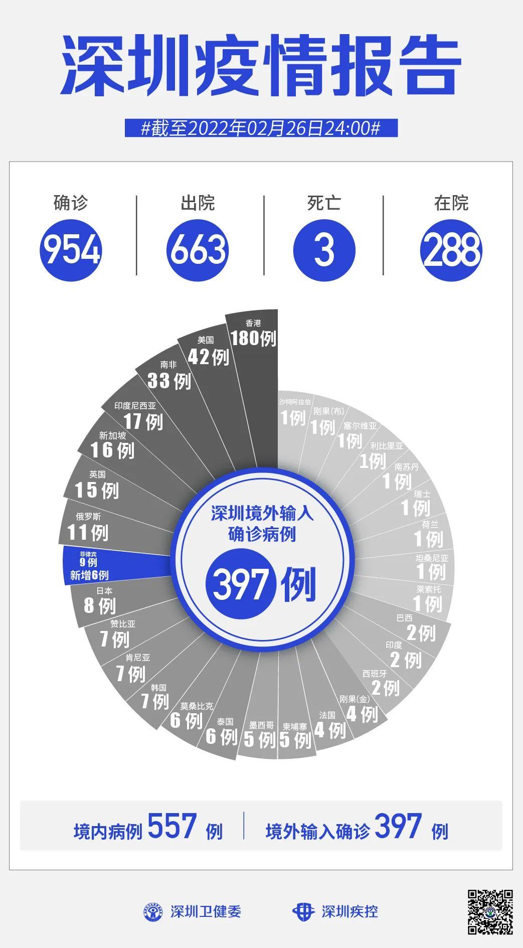 2月26日0-24时,深圳新增26例本土确诊病例和4例新冠病毒无症状感染者,新增6例境外输入确诊病例。