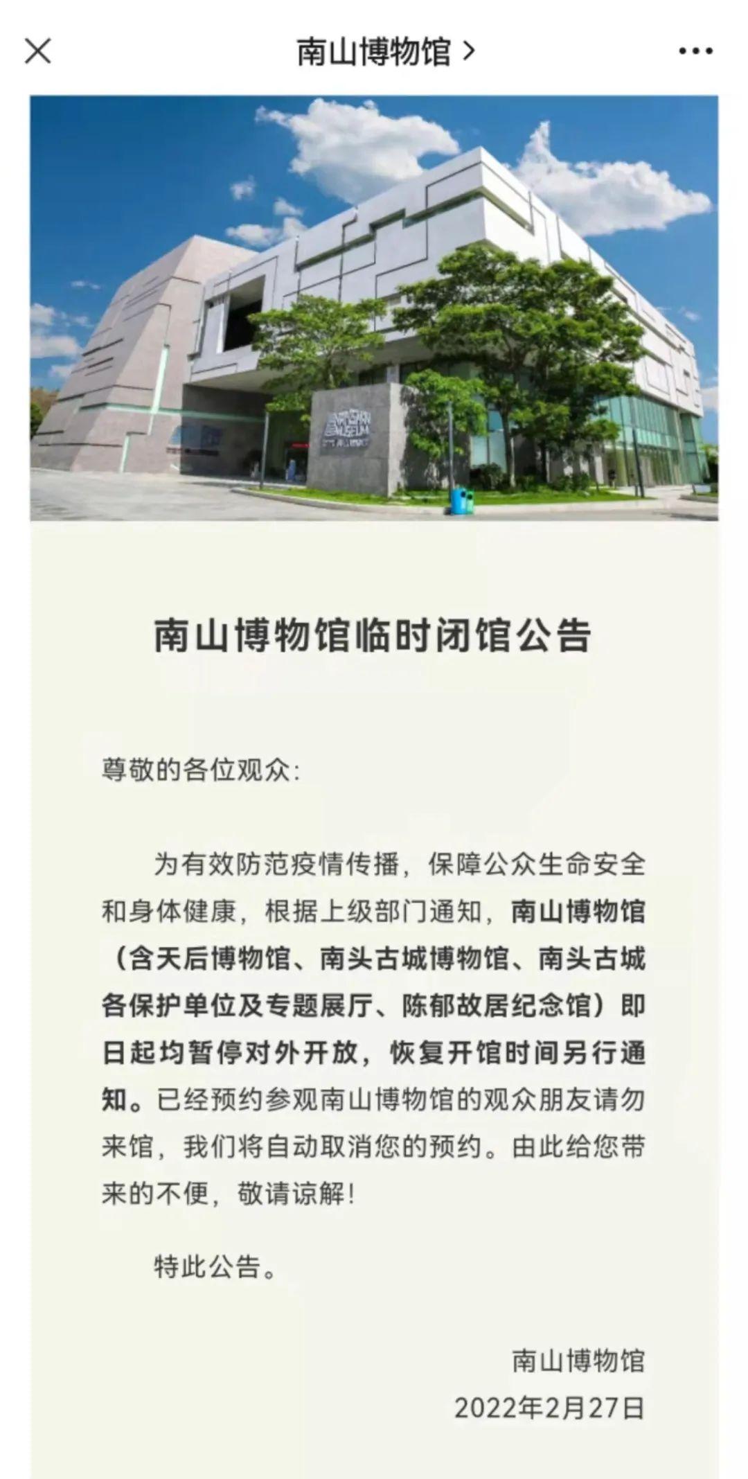 2月26日晚间,深圳图书馆、深圳博物馆、深圳市文化馆、深圳少年儿童图书馆、南山博物馆等多个文化场馆发布公告称,将临时闭馆。