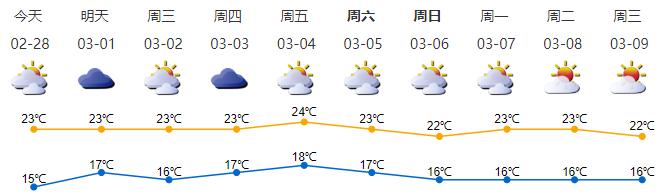 ●2月28日,多云间阴天,偶有零星小雨,早晚有轻雾或霾,气温15~23℃;3月1日—2日云量增多,间中有零星小雨和(轻)雾;3月3日—4日多云,局地偶有零星小雨;3月5日—6日受新一股冷空气影响,温度小幅下降伴分散小雨。