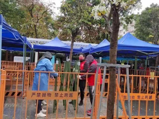 在康欣社区景蜜村公园核酸检测点,一群红马甲们忙碌得满头大汗,冷风冷雨中分不出雨水和汗水。2月20日下午,刚到岗的区政协下沉志愿者小陈看到现场堆放着刚送来还来不及搭的雨棚,就赶紧行动起来协助雨棚的搭建,检测现场的其他义工和志愿者看到,纷纷过来支援,他们相视一笑,顾不得擦去身上的雨水和汗水。