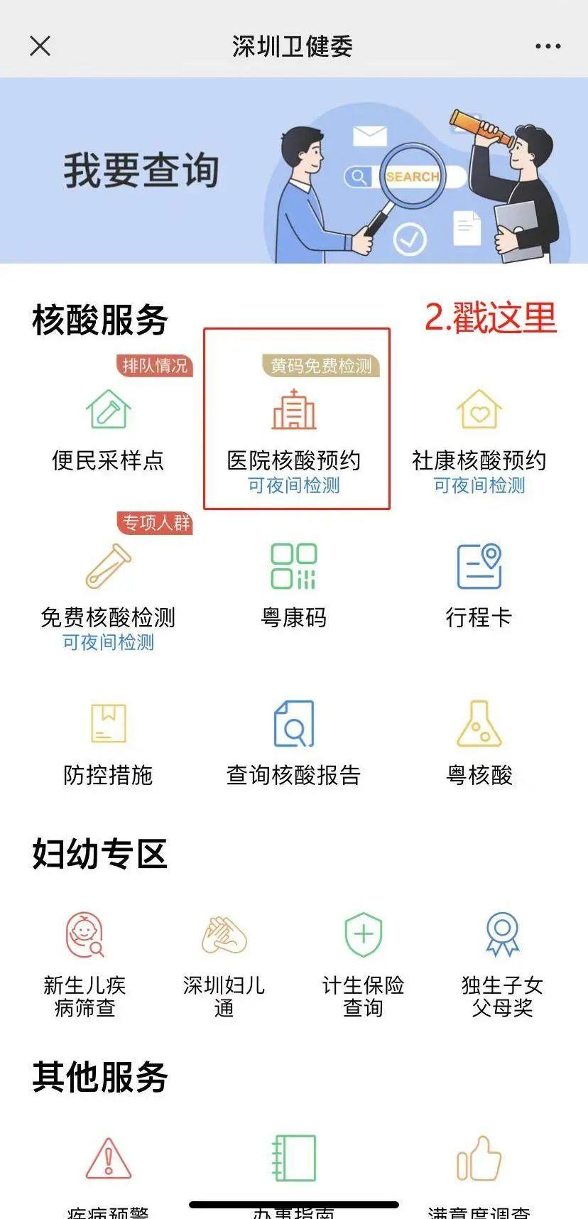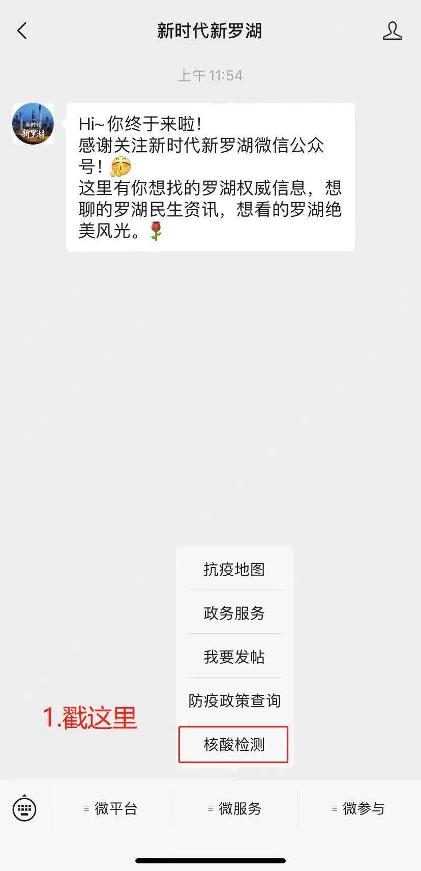 2.菜单栏戳【微服务】-【核酸检测】,长按识别二维码进入小程序。