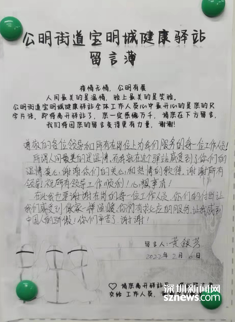 虎年春节大年初二,邵锦莉就回到了工作岗位。春节原本是团圆佳节,但隔离酒店专班的工作人员和隔离客人都没法与家人团聚,让邵锦莉真切感受到了大家的不容易。“隔离不隔爱,春节期间,我们给隔离客人额外准备了一些慰问品,或者给小孩子送去一些小玩具,尽量让他们在隔离期间住得舒适。”邵锦莉告诉记者,每当客人解除隔离时,他们都会写下暖心的留言,“其中有一封信写到以后要到深圳工作,这是对我们工作的肯定,也让我们对做好隔离酒店的工作充满信心”。