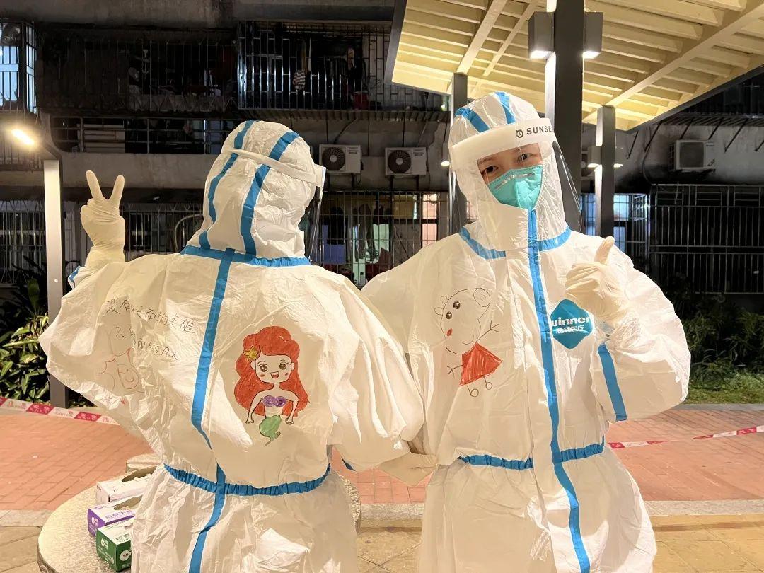 ▲在东晓街道松泉公寓核酸采样点,医护人员趁着换班间隙,互相为对方“打气”。