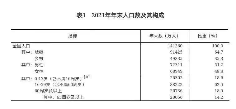 年末全国人口141260万人,比上年末增加48万人,其中城镇常住人口91425万人。全年出生人口1062万人,出生率为7.52‰;死亡人口1014万人,死亡率为7.18‰;自然增长率为0.34‰。全国人户分离的人口5.04亿人,其中流动人口3.85亿人。