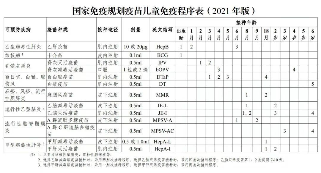 表格来源于《国家免疫规划疫苗儿童免疫程序及说明(2021年版)》