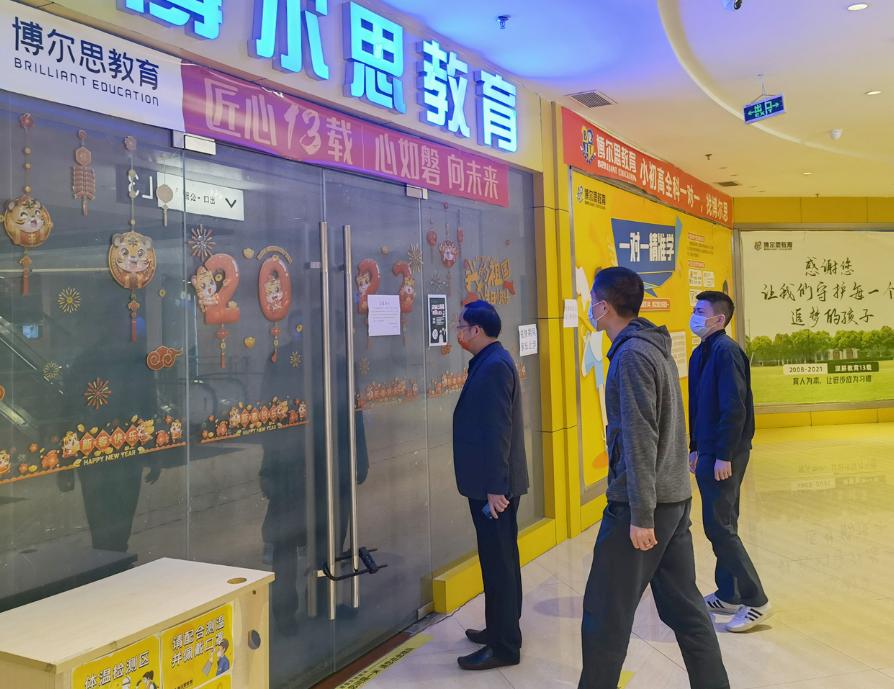 在对华富街道现代演艺中心、园岭街道百花新天地、香蜜湖街道东海城市广场、梅林街道喜地美育文化中心等场所的巡查中,检查组看到,大部分机构处于关停状态,并在显著位置张贴有《关于暂停全市校外培训服务和校外托管服务的通告》,个别机构仅有1名前台值班人员负责咨询,入口处严格执行测温、扫码、验码的程序,均符合要求。机构人员向检查组承诺,将全力配合疫情防控要求,并做好教职人员的每日健康台账。