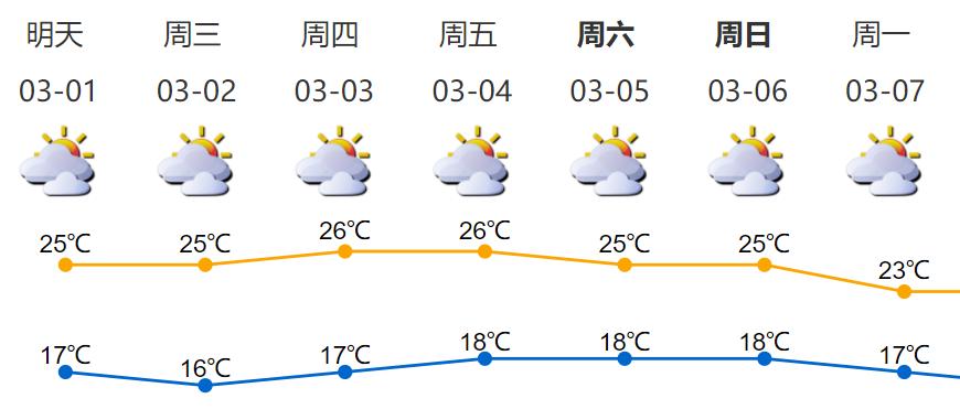 3月1-2日云量增多,间中偶有零星小雨和(轻)雾,1日气温17-25℃;