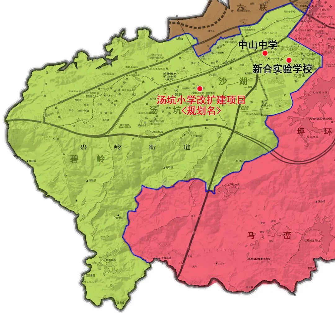 汤坑小学改扩建项目初中部与中山中学、新合实验学校初中部组成大学区。