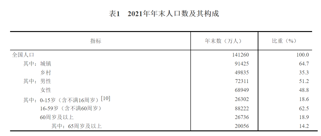 2021年年末全国人口141260万人,比上年末增加48万人,其中城镇常住人口91425万人。全年出生人口1062万人,出生率为7.52‰;死亡人口1014万人,死亡率为7.18‰;自然增长率为0.34‰。全国人户分离的人口5.04亿人,其中流动人口3.85亿人。
