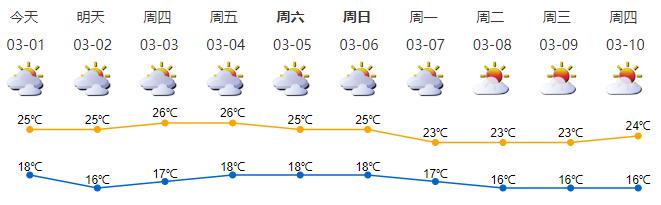 ●3月1日,多云间阴天,局部有零星小雨,早晚有轻雾,气温18~25℃;3月2日多云间阴天;3月3日—6日多云为主,早晚有轻雾或雾;3月7日受弱冷空气影响,云量增多,局部有零星小雨。