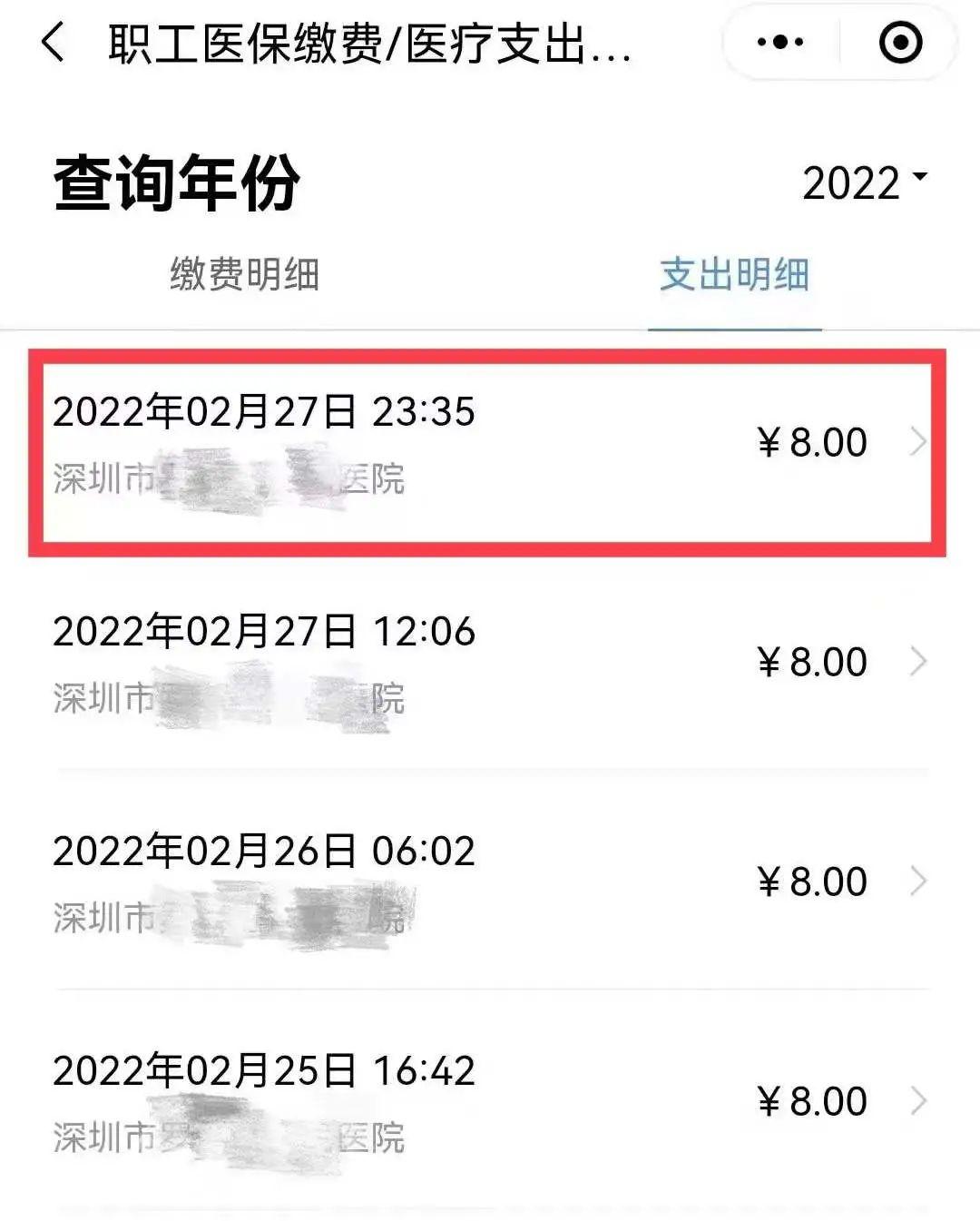 小王是在职一档参保人,收到社区通知,于2月23日上午就近到社区的采样点接受核酸检测,2月26日在粤省事小程序上查到深圳市某医院的医保支出明细记录。