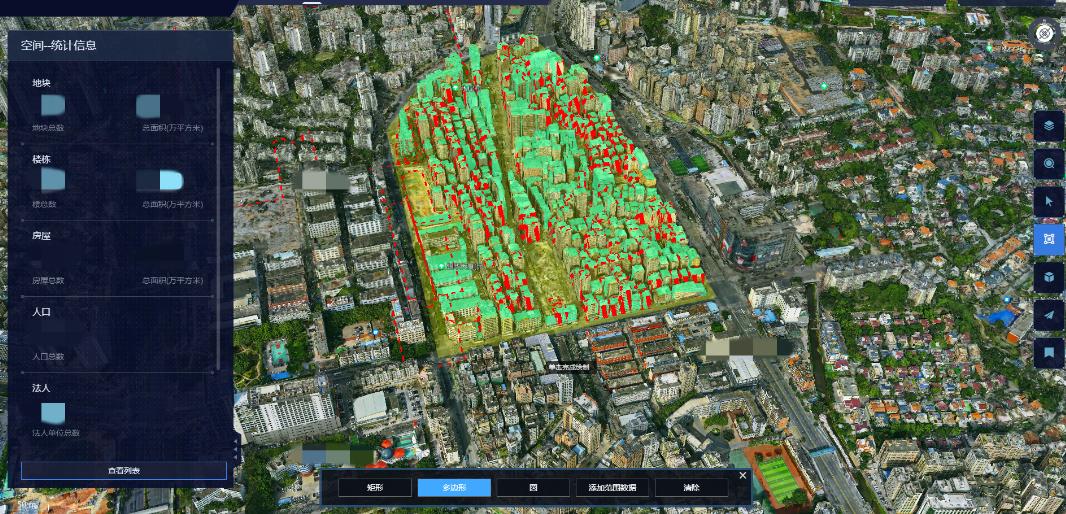 系统接入卫片、航拍、电子地图等图层信息,与BIM和CIM相结合,实现重点人员轨迹、封控管控防范区、特定区域的楼栋、房屋情况3D立体落图,全局布防可视化,一键科学划定“重点区域”,并显示该区域相关重要信息数据。