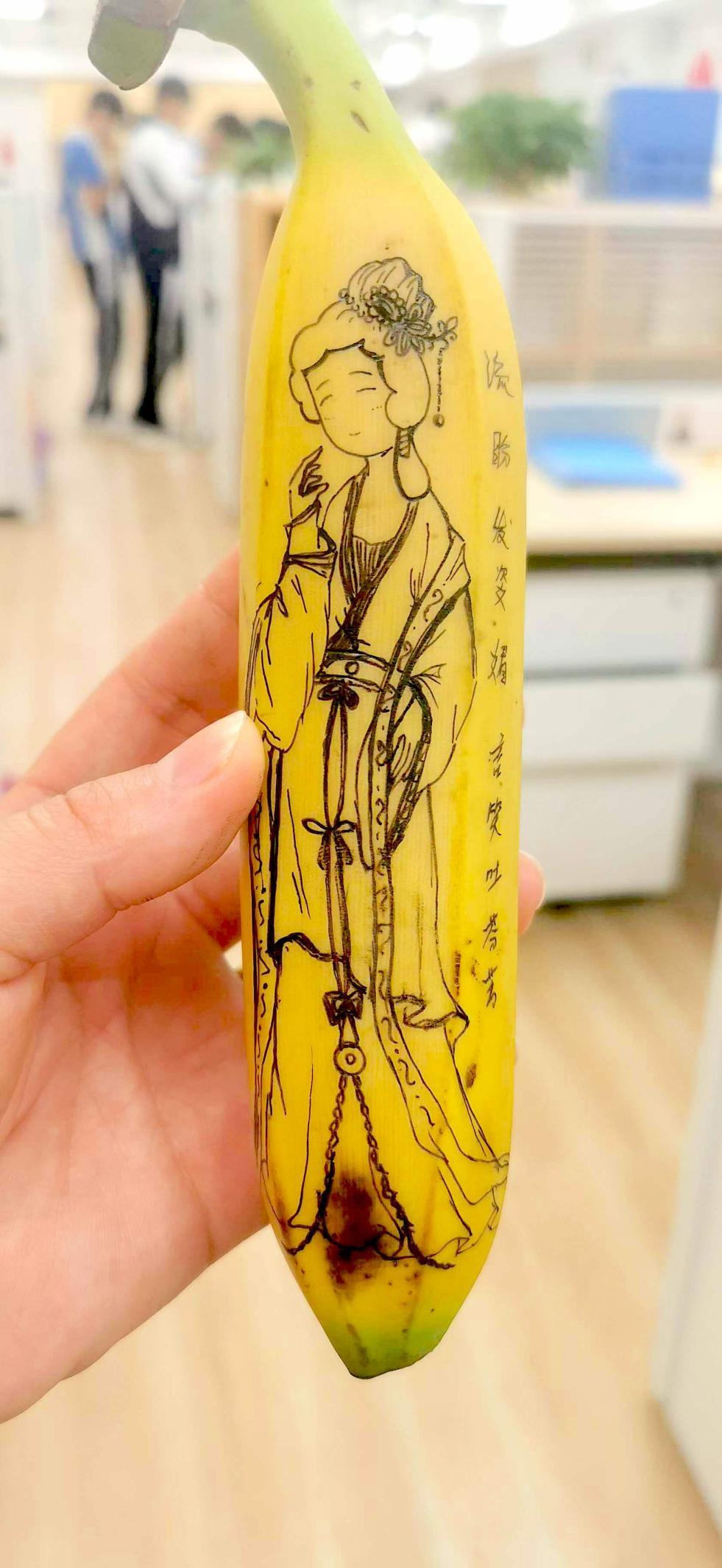 ▲学生在香蕉皮上作画,以此感谢老师在校陪伴
