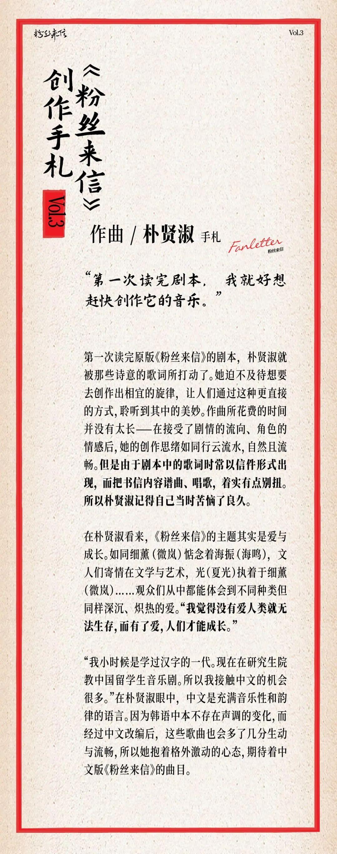 苏: 之前编剧曾在节目册上这样写道:“因为一行文字重新振作起来,反复哼唱一小段音乐,对熬过工作中那些艰难瞬间所产生的共鸣,让这部作品来到了这里。”可能大家都会有类似的想法。看着用一句话克服困难的细薰,会不会一起心痛、产生共鸣,再一起前进呢?在我看来,《粉丝来信》讲述的是一个令人惋惜的故事——原本纯真的爱和心灵,因为各种误会被谎言所覆盖、吞噬。