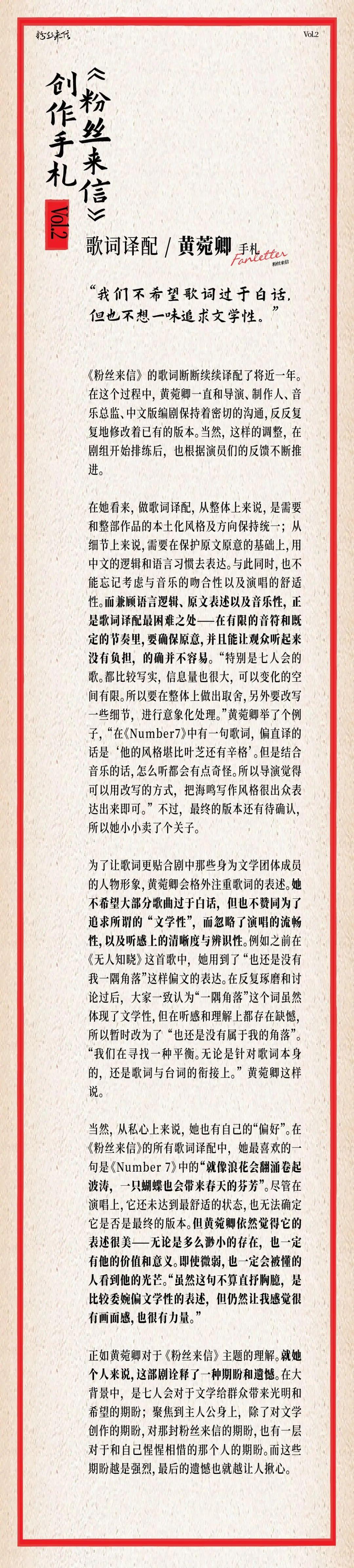 苏: 在音乐剧中,音乐和台词都非常重要。当感情达到最高潮的时候,就需要用歌曲来传达相应的情绪。而在音律中加入语言,再进一步传递,感情便也会随着音律自然地融化,收获更强烈的效果。特别是《粉丝来信》有着多样的音乐体裁和节奏,让人相当耳目一新。