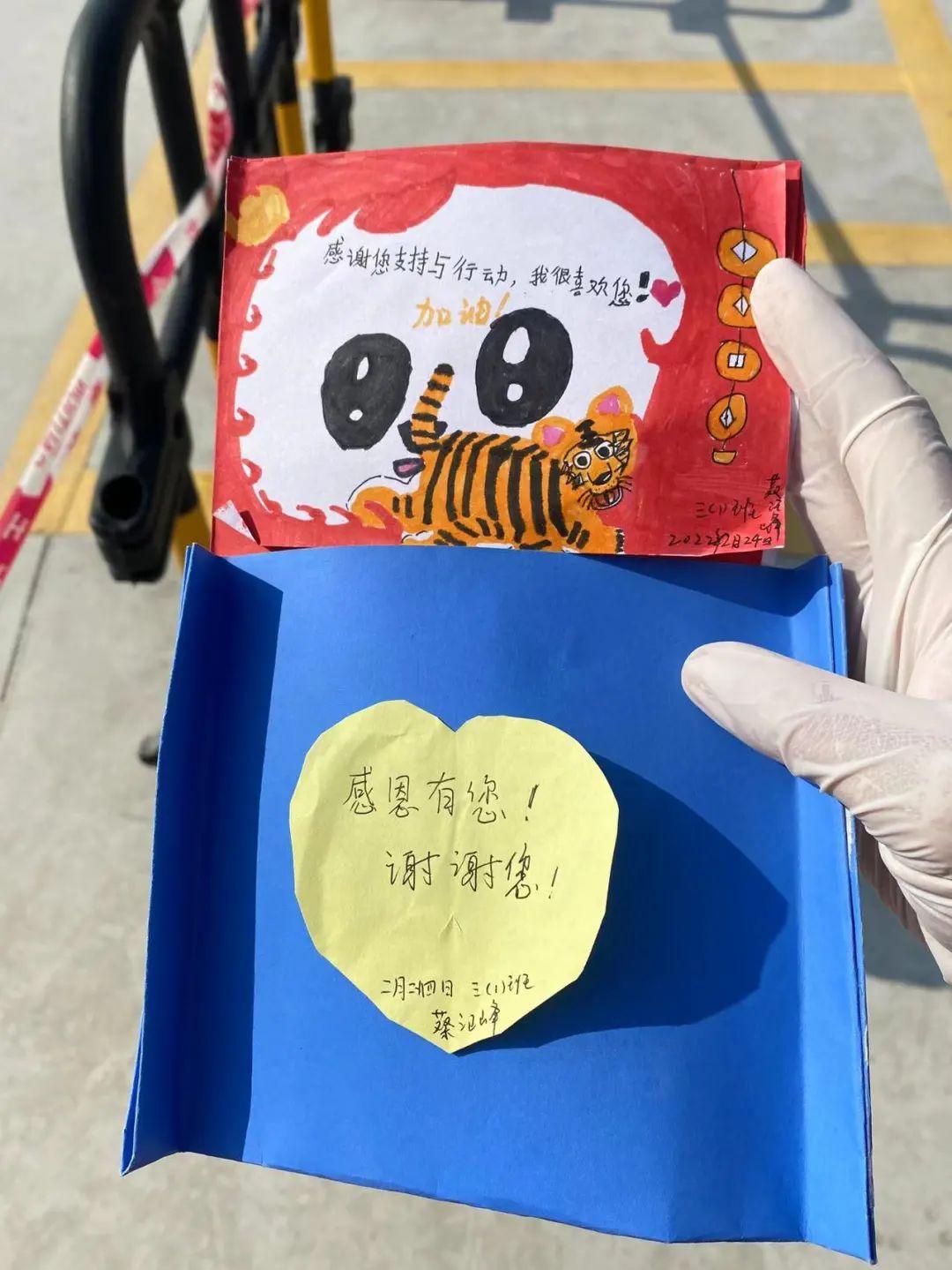 在葵涌办事处惠民市场核酸检测采样点,一名小朋友将自己画的老虎和雪容融感谢贴纸送给一线防疫工作人员,上面写着“感谢有您!谢谢您!”。此举让防疫工作人员非常感动,也赠送了一本练习册给小朋友。