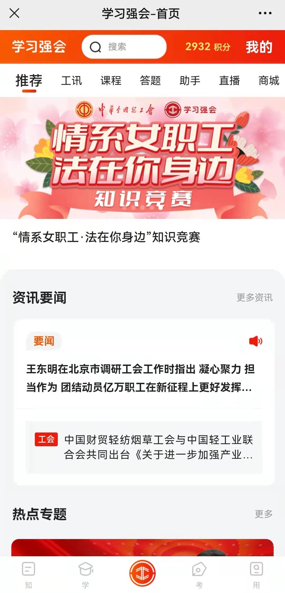 为认真学习贯彻习近平新时代中国特色社会主义思想,全面贯彻党的十九大和十九届历次全会精神,贯彻落实《中国妇女发展纲要(2021-2030年)》,由全总女职工部和全总法律工作部主办、“学习强会”平台承办的“情系女职工 法在你身边”知识竞赛3月1日开赛。