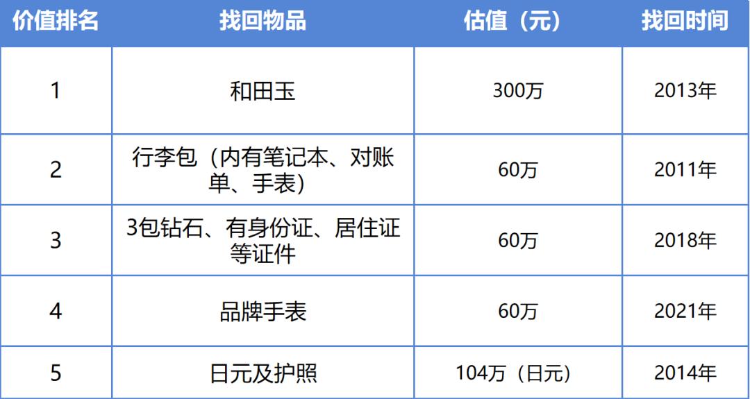 ∆ 找回物品估值前五名情况