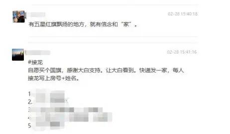 “好牛啊,要一起唱国歌吗?”与此同时,这几位居民还把悬挂国旗的照片发在了业主群里。“大家动起来,一起为防疫工作加油。”一位居民这样说道。于是,业主群变得活跃起来,大家纷纷在群里接龙,自发在网上下单购买国旗,准备一起悬挂在窗外,以这样的方式为疫情防控工作打气。