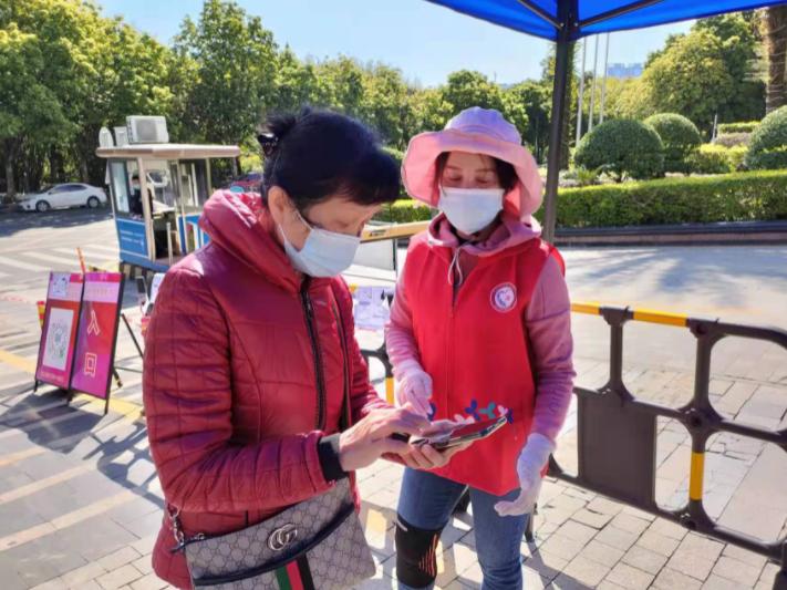 张海燕(右)在核酸检测采样点为居民提供志愿服务。