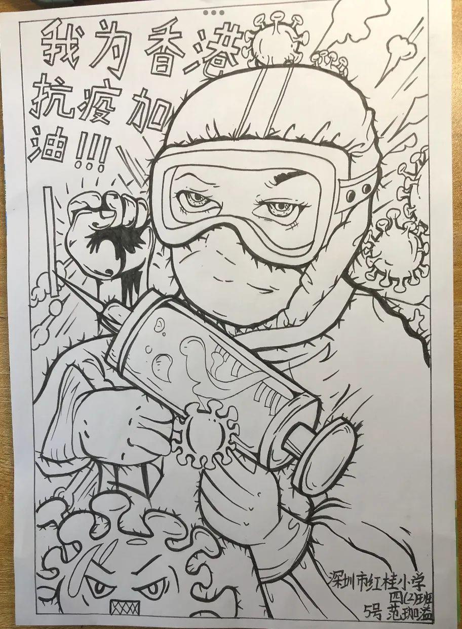 范珈溢同学的作品《我为香港抗疫加油》中的白衣战士目光坚毅,体现了战胜疫情的决心……
