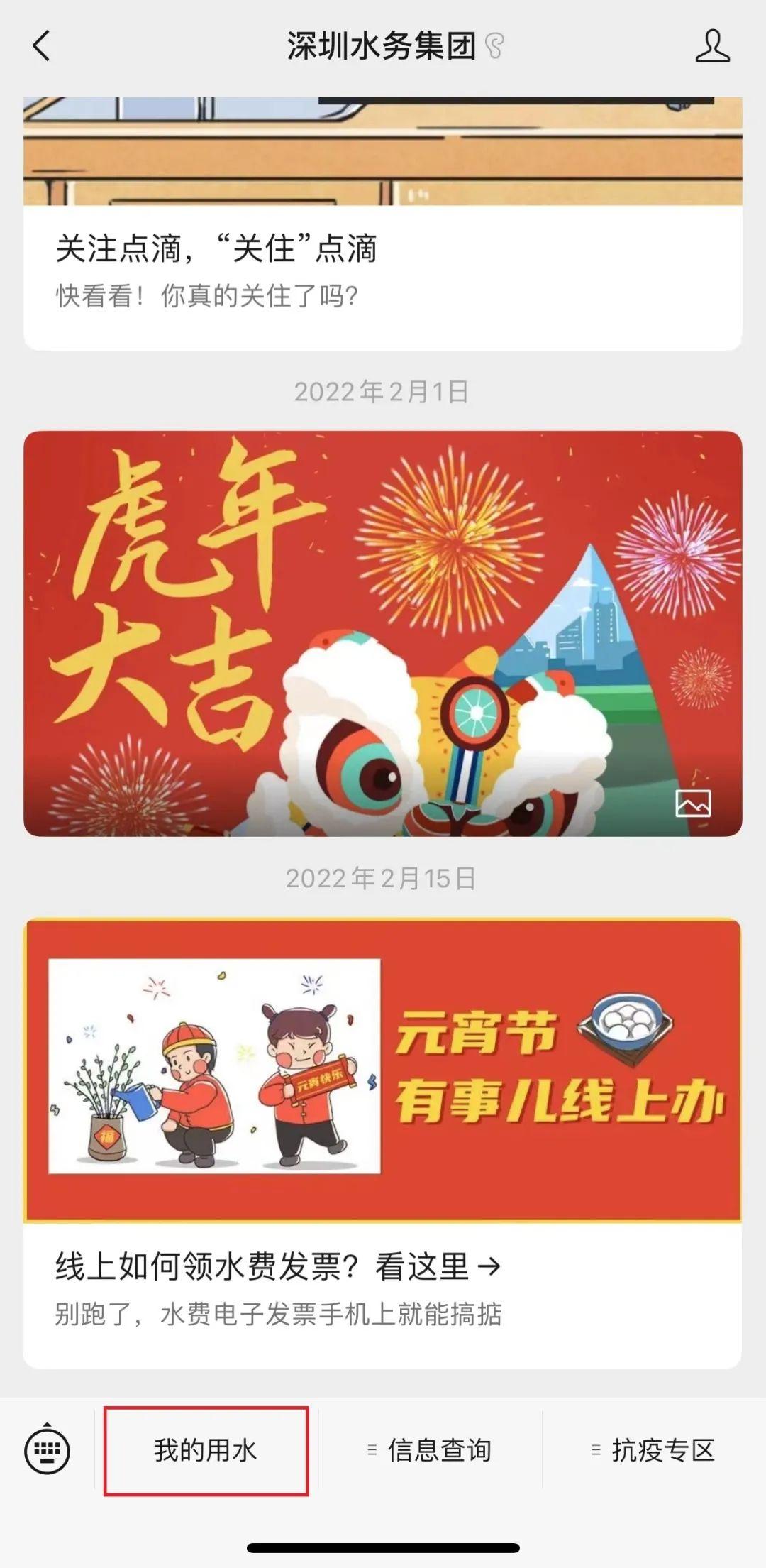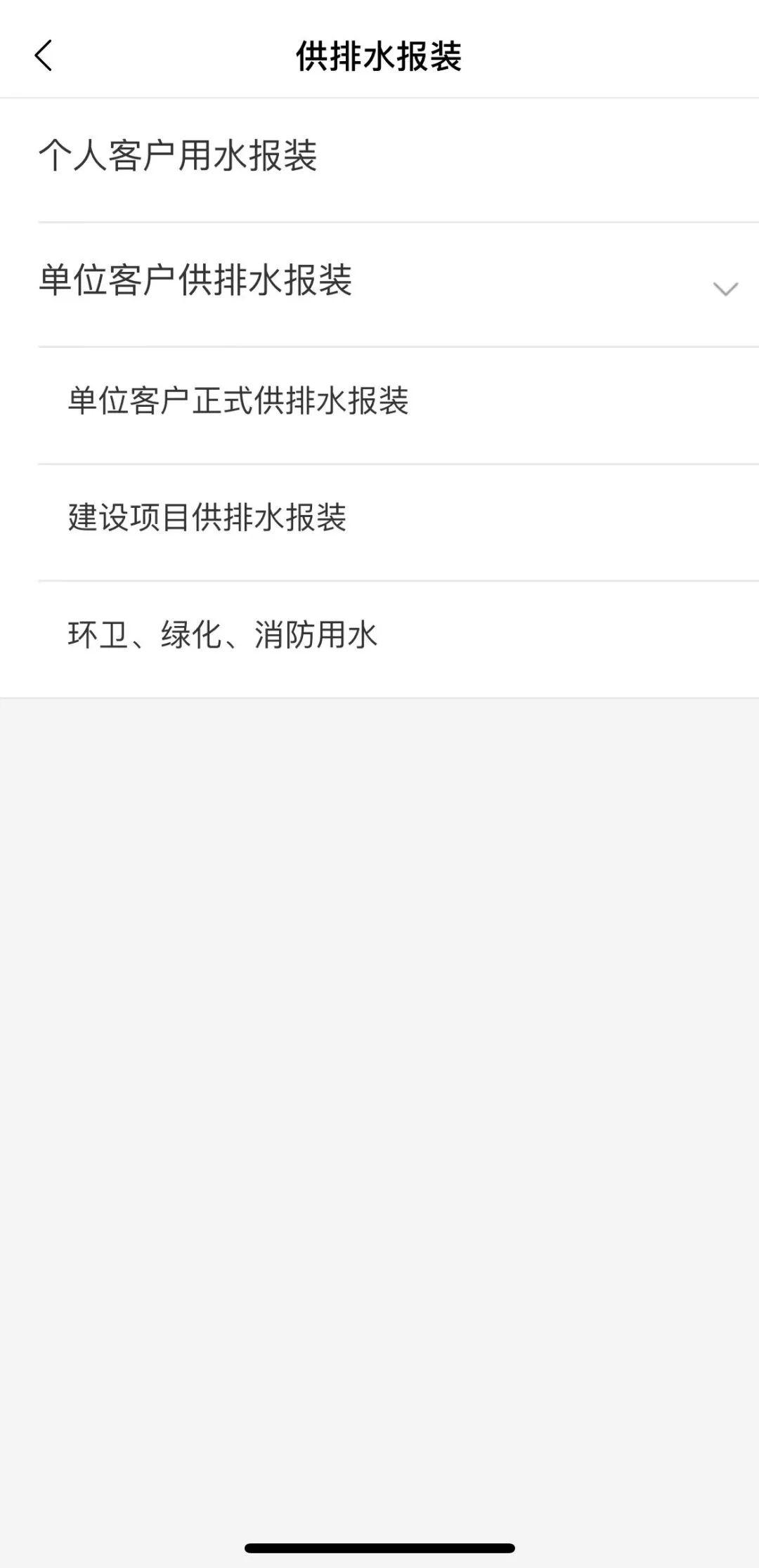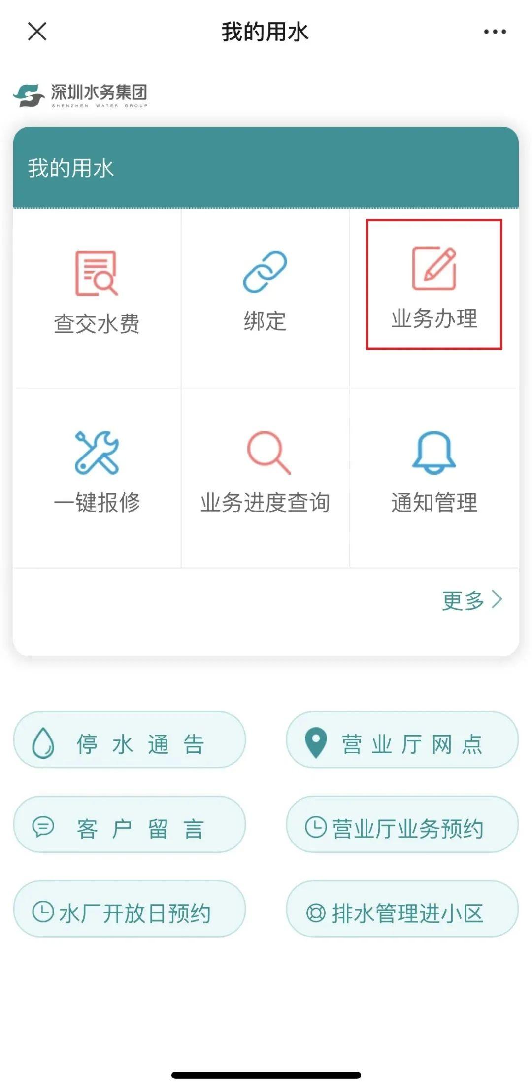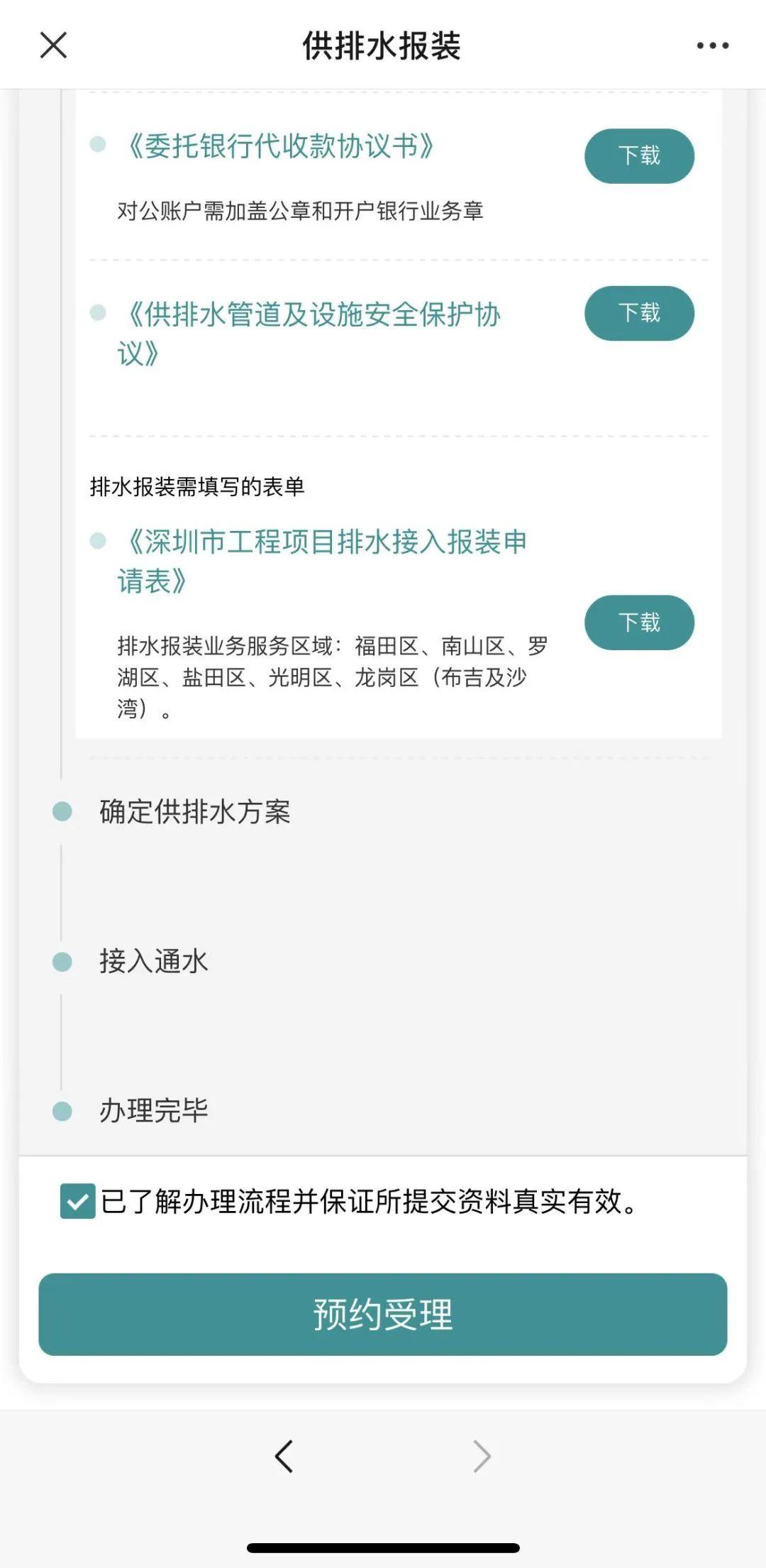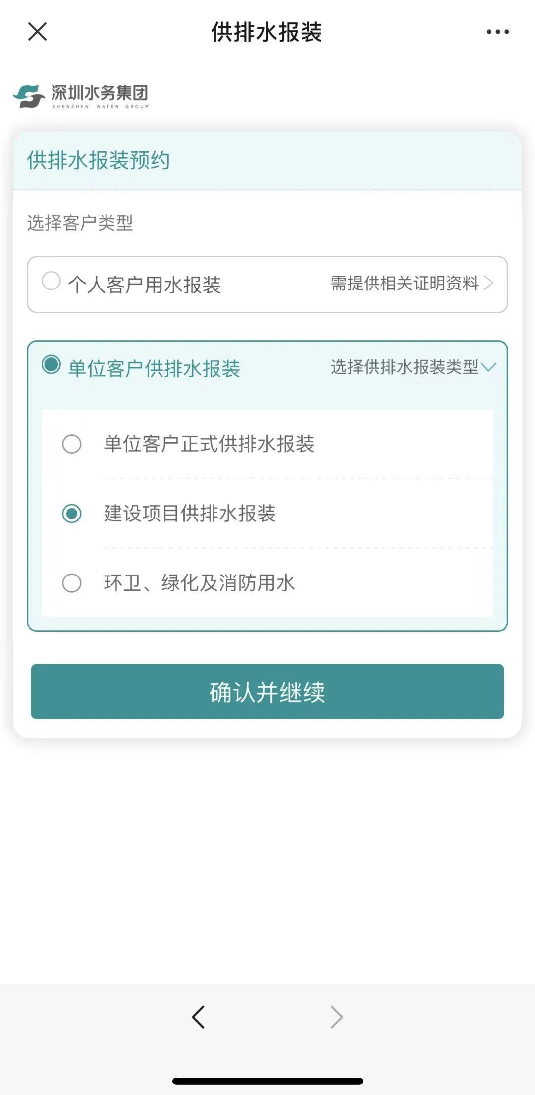 ③ 关注“深圳水务集团”微信公众号,点击下方菜单栏“我的用水”,进入后点击“业务办理”→“供排水报装”→“单位客户供排水报装”→“建设项目供排水报装”,下拉点击“预约受理”。
