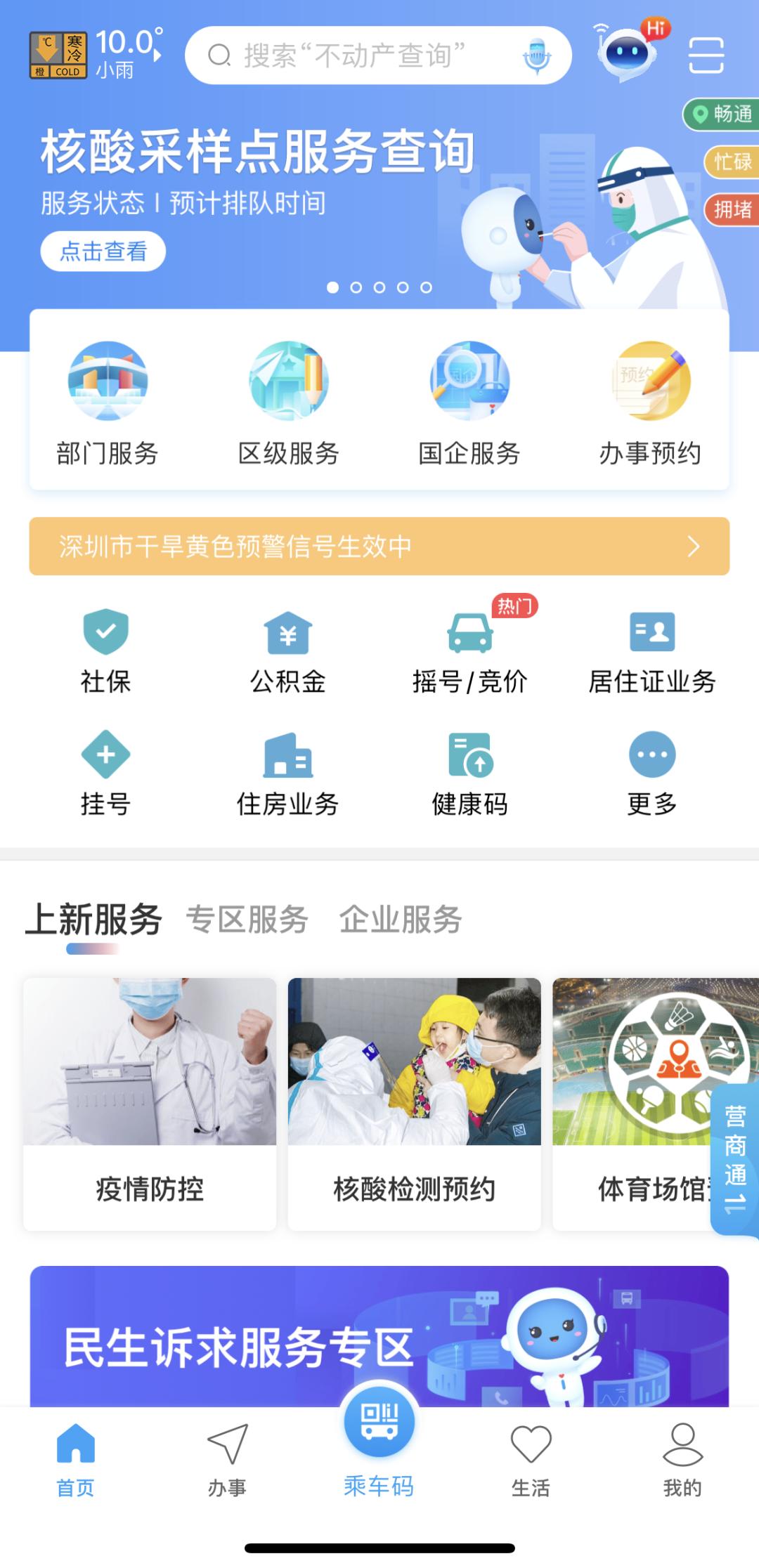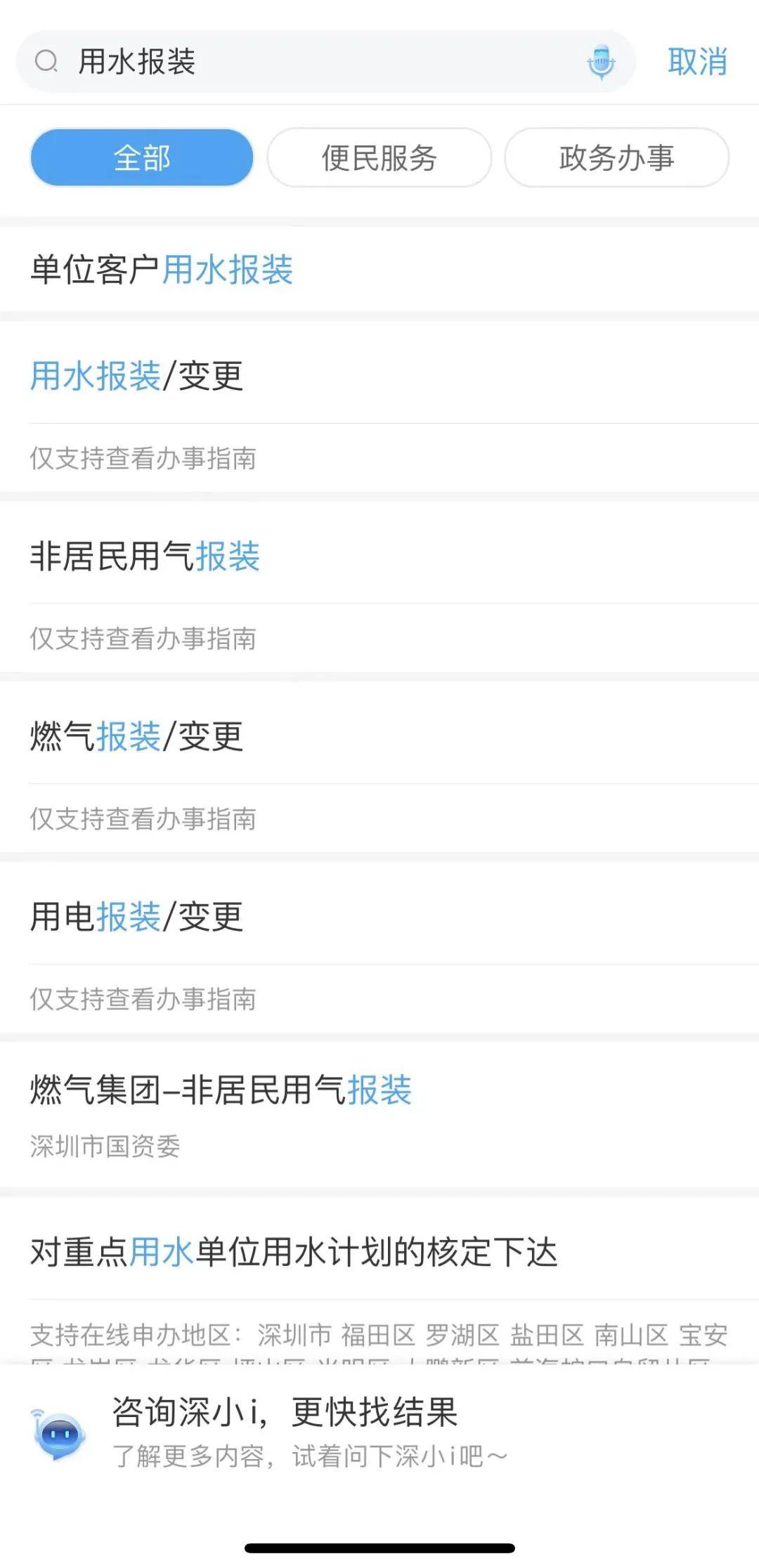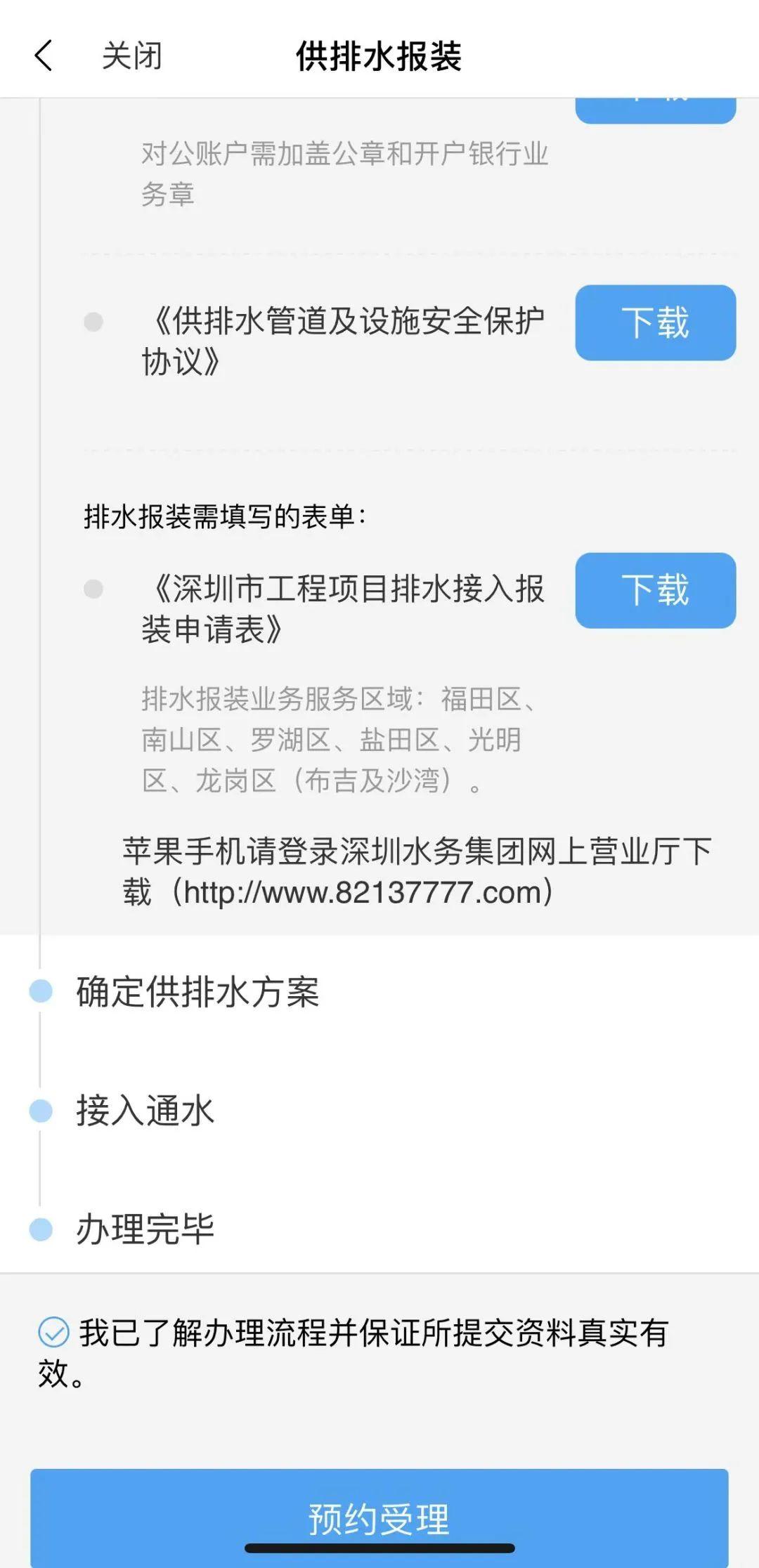 ② 登录“i深圳”APP,在首页搜索“用水报装”,点击“单位客户用户报装”,点击“建设项目供排水报装”,下拉点击“预约受理”。