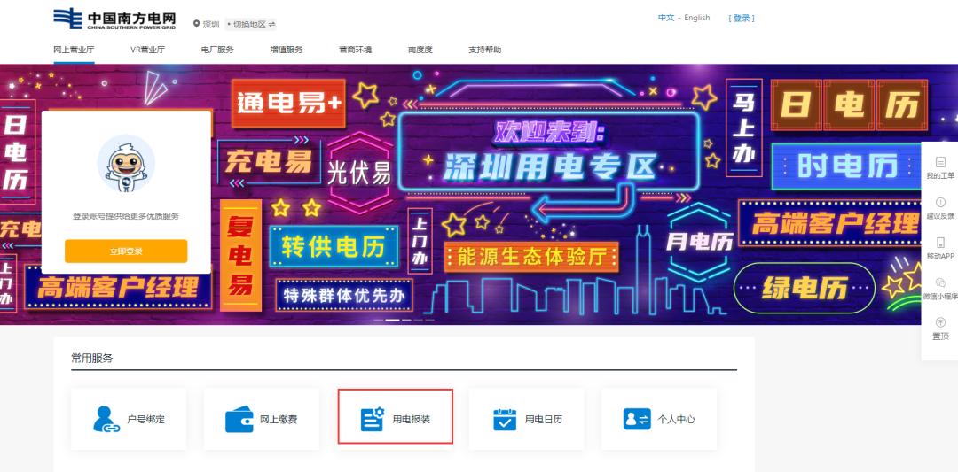 ① 搜索“南方电网”即可直达网上营业厅,点击首页“用电报装”按要求办理。
