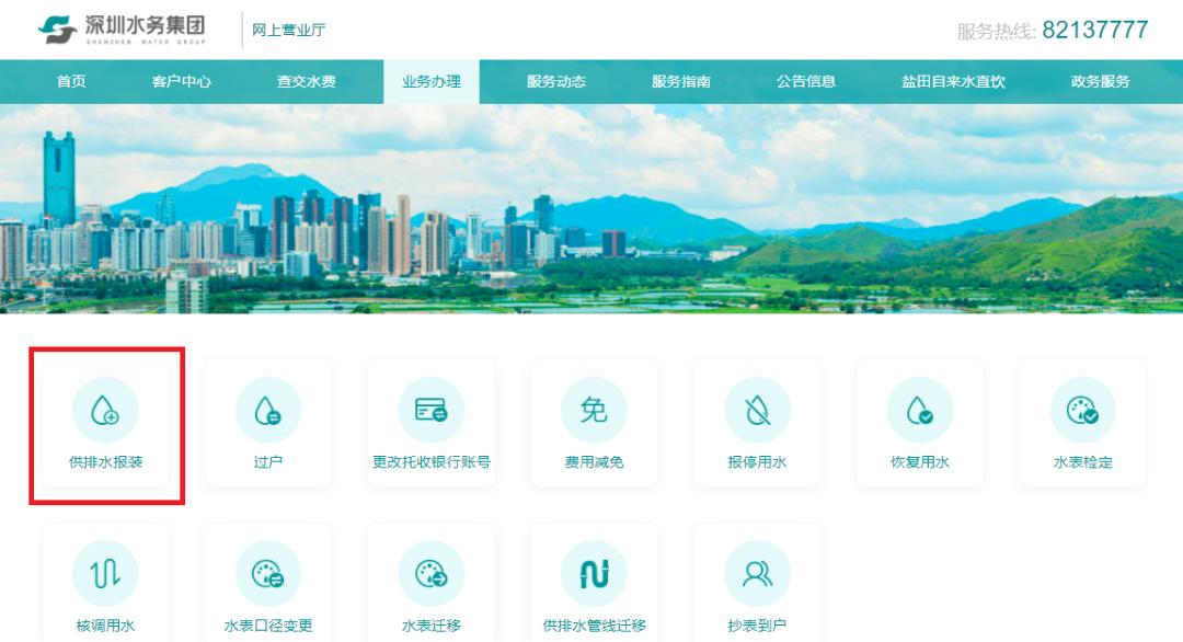 ① 登录“深圳水务集团”官网网上营业厅,点击首页“供排水报装”按要求办理(www.82137777.com)。