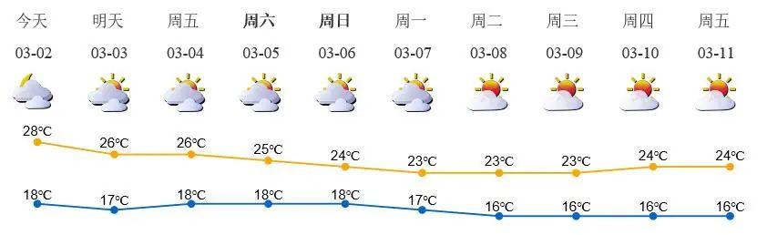 ●3月2日多云,早晚有轻雾;气温17~28℃;东北风3~4级阵风6级;相对湿度50%~90%。3一6日多云为主,早晚有轻雾或雾;7日弱冷空气影响,云量增多,局部有零星小雨。