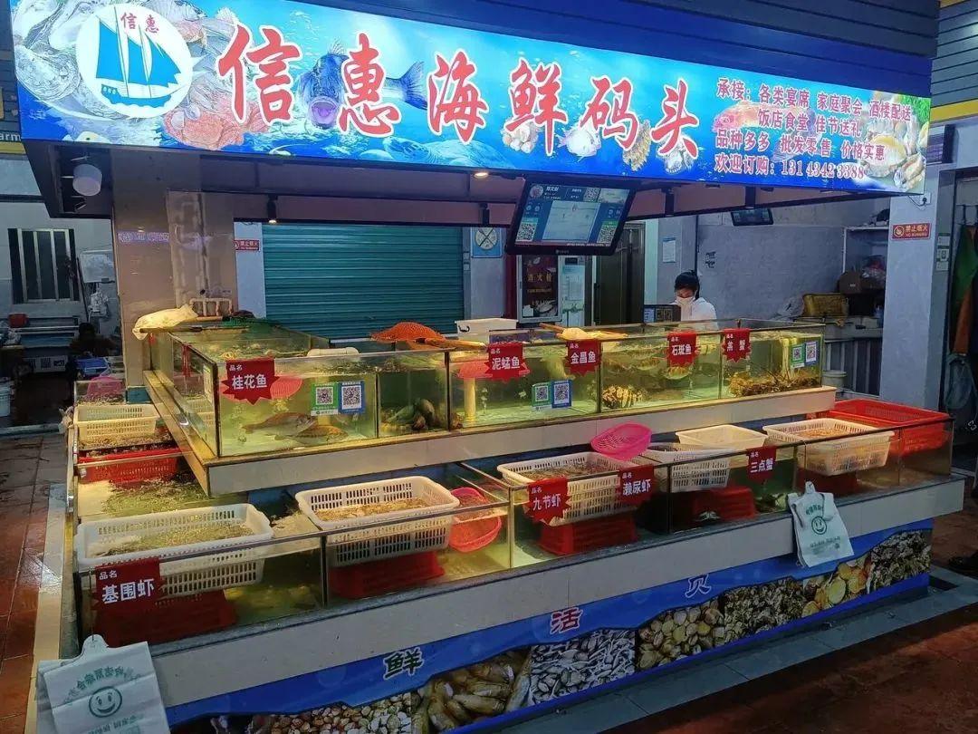 在猪肉档口,前来买肉的市民有序排着队,不远处还开设了专卖羊肉的档口,每日供应海南黑山羊;在水产档口,鱼类、虾等水产在水箱内来回游动,吸引了众多喜欢“尝鲜”的市民前来选购。