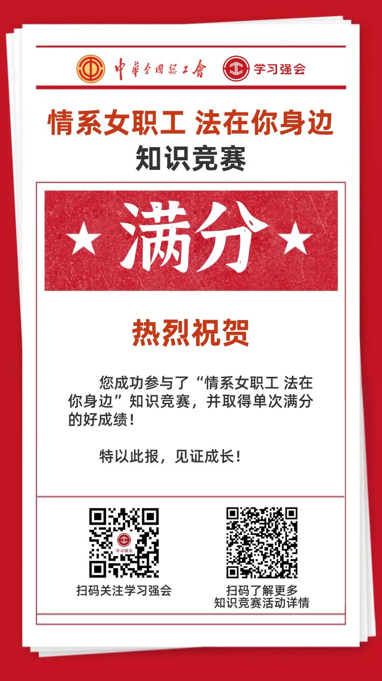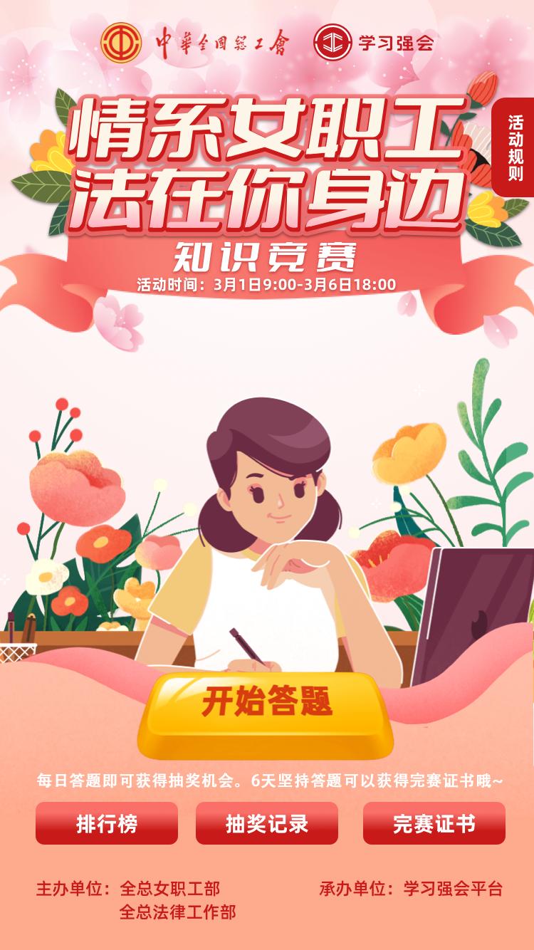 为认真学习贯彻习近平新时代中国特色社会主义思想,全面贯彻党的十九大和十九届历次全会精神,贯彻落实《中国妇女发展纲要(2021-2030年)》,由全总女职工部和全总法律工作部主办,由“学习强会”平台承办的“情系女职工 法在你身边”知识竞赛3月1日开赛。