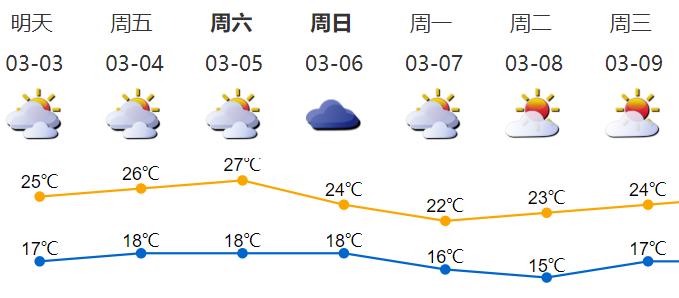3-6日多云温暖,早晚有轻雾或雾,其中3日气温17-25℃;6日夜间受冷空气影响,偶有零星小雨 ,北风加大。