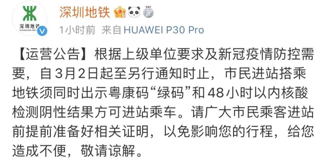 根据上级单位要求及新冠疫情防控需要,自3月2日起至另行通知时止,市民进站搭乘地铁须同时出示粤康码“绿码”和48小时以内核酸检测阴性结果方可进站乘车。请广大市民乘客进站前提前准备好相关证明,以免影响您的行程,给您造成不便,敬请谅解。