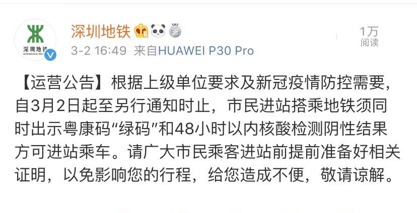3月2日下午16时许,深圳地铁发布运营公告称:根据上级单位要求及新冠疫情防控需要,自3月2日起至另行通知时止,市民进站搭乘地铁须同时出示粤康码“绿码”和48小时以内核酸检测阴性结果方可进站乘车。