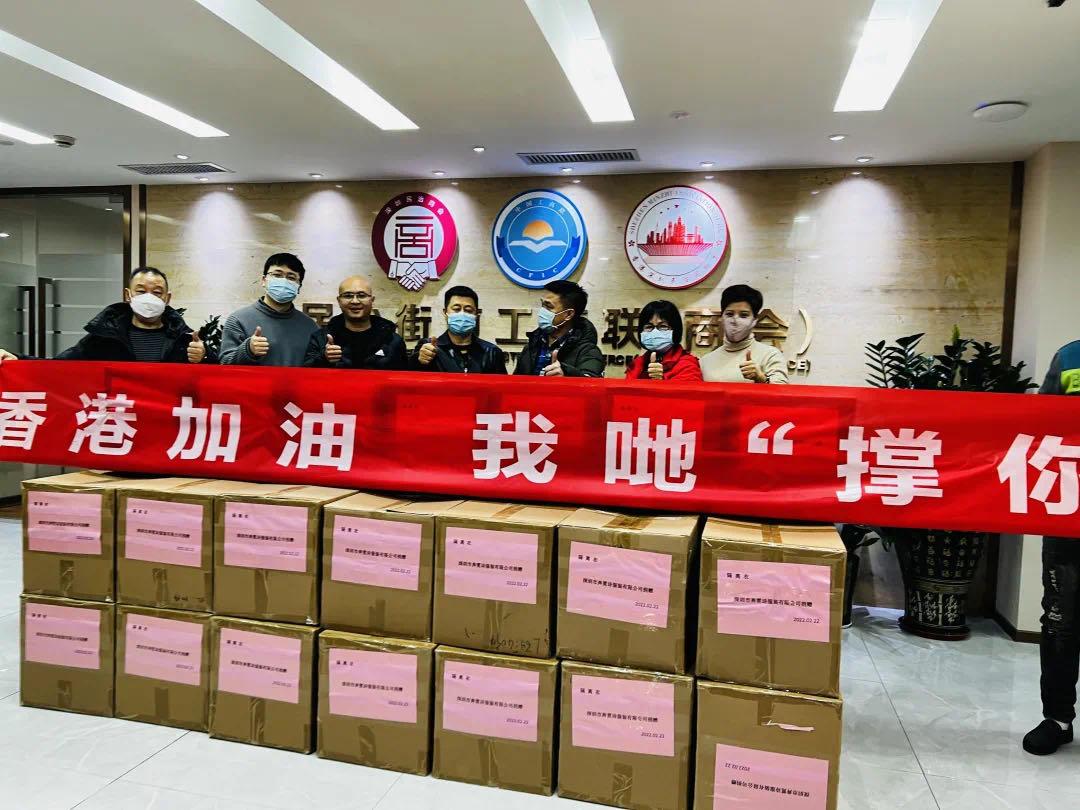 这一天,区工商联团体会员深圳潮青商会捐赠价值28万元的物资支援香港抗疫,其中包括10000盒新冠检测试剂、50000只N95口罩以及2000个血氧仪。