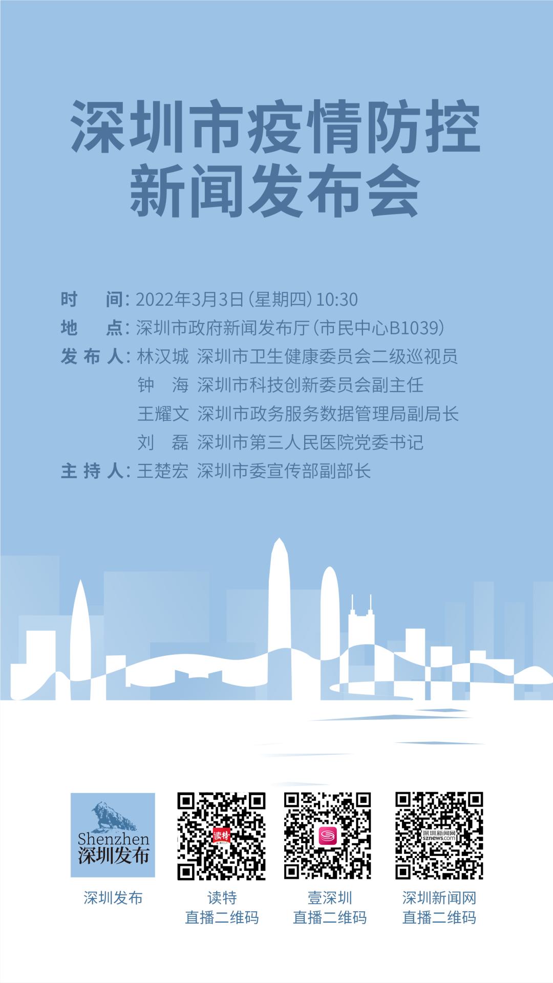 2022年3月3日(星期四)10:30,我市将举行疫情防控新闻发布会,邀请市卫生健康委、市科技创新委、市政务服务数据管理局、市第三人民医院有关负责人出席,通报我市疫情防控最新情况,并回答记者提问,敬请关注。