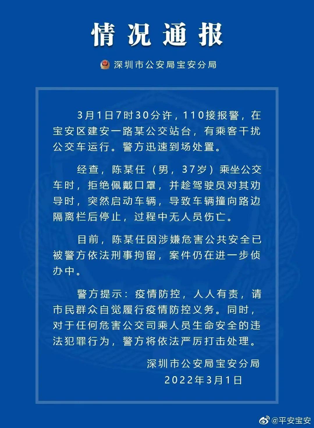 据通报,3月1日7时30分许,110接报警,在宝安区建安一路某公交站台,有乘客干扰公交车运行。警方迅速到场处置。经查,陈某任(男,37岁)乘坐公交车时,拒绝佩戴口罩,并趁驾驶员对其劝导时,突然启动车辆,导致车辆撞向路边隔离栏后停止,过程中无人员伤亡。