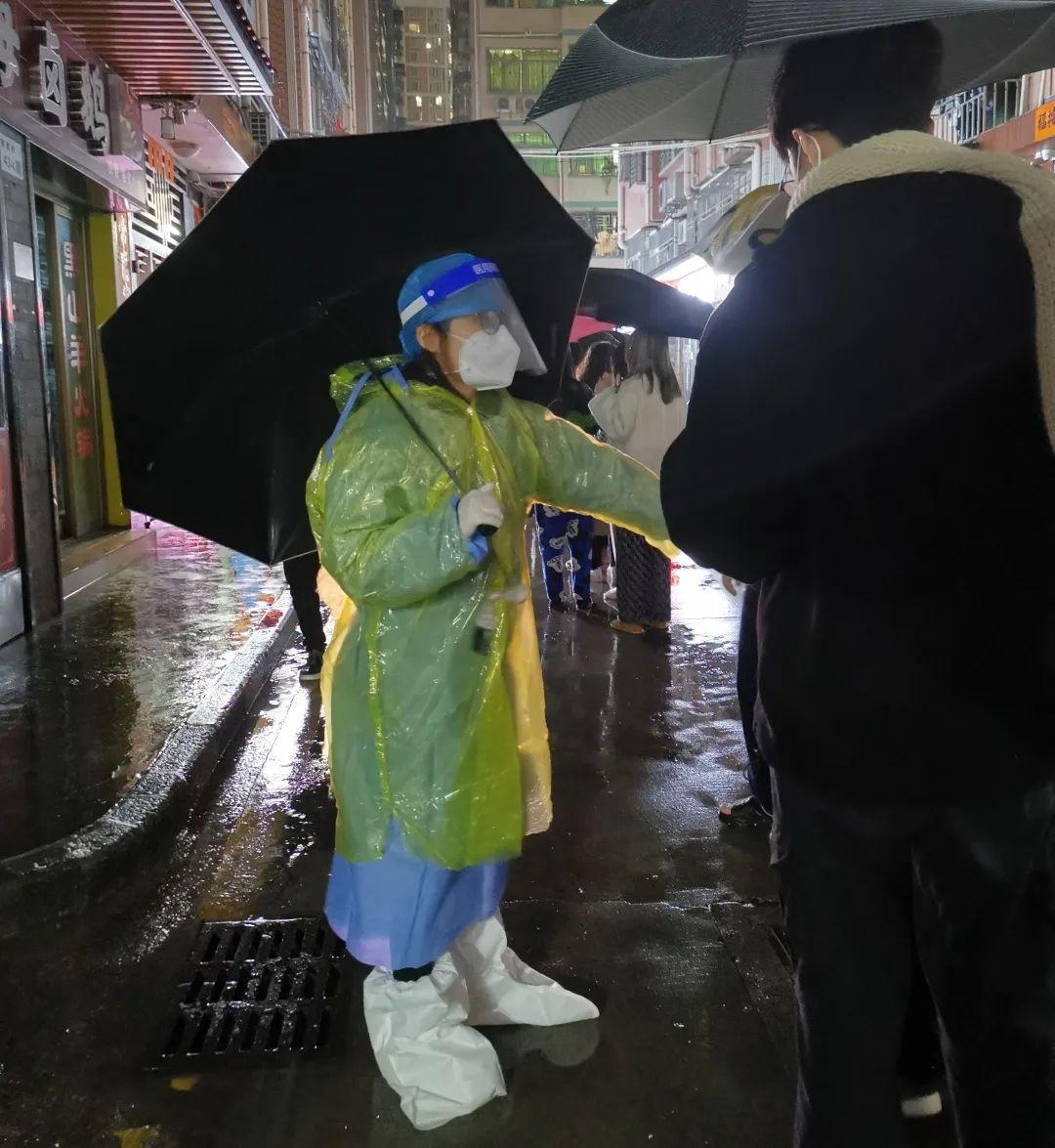 “我还记得有一次大概23时的时候,一直下着雨,温度特别低,核酸检测点没有固定的休息位置,我们10来个工作人员累了就在附近的居民楼边上靠一靠。快收工的时候,有一个小吃店的老板给我们送来了热水和一次性杯子,他还叮嘱我们如果不喝也别忘了暖暖手,热水不够随时都能过去添。”