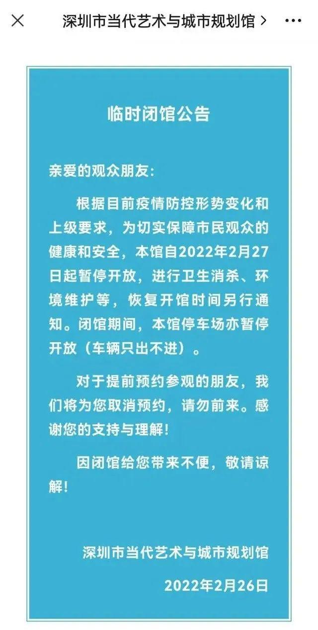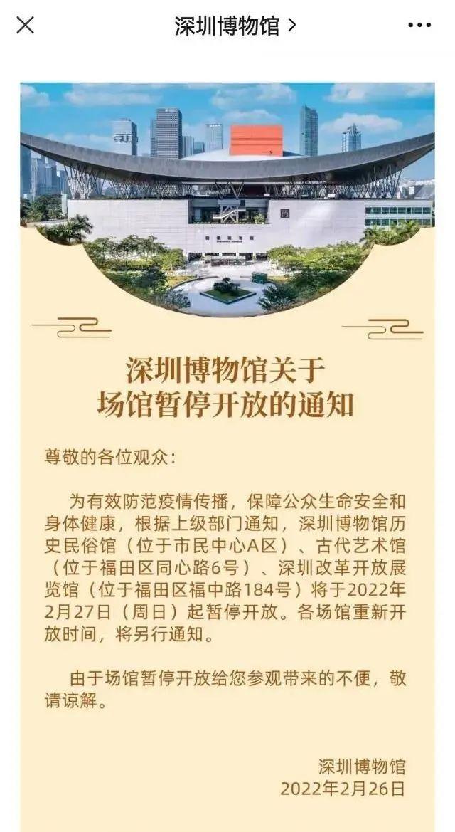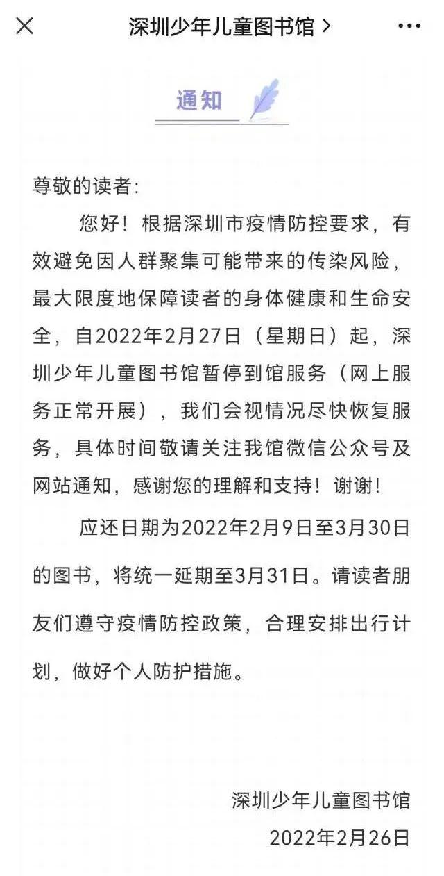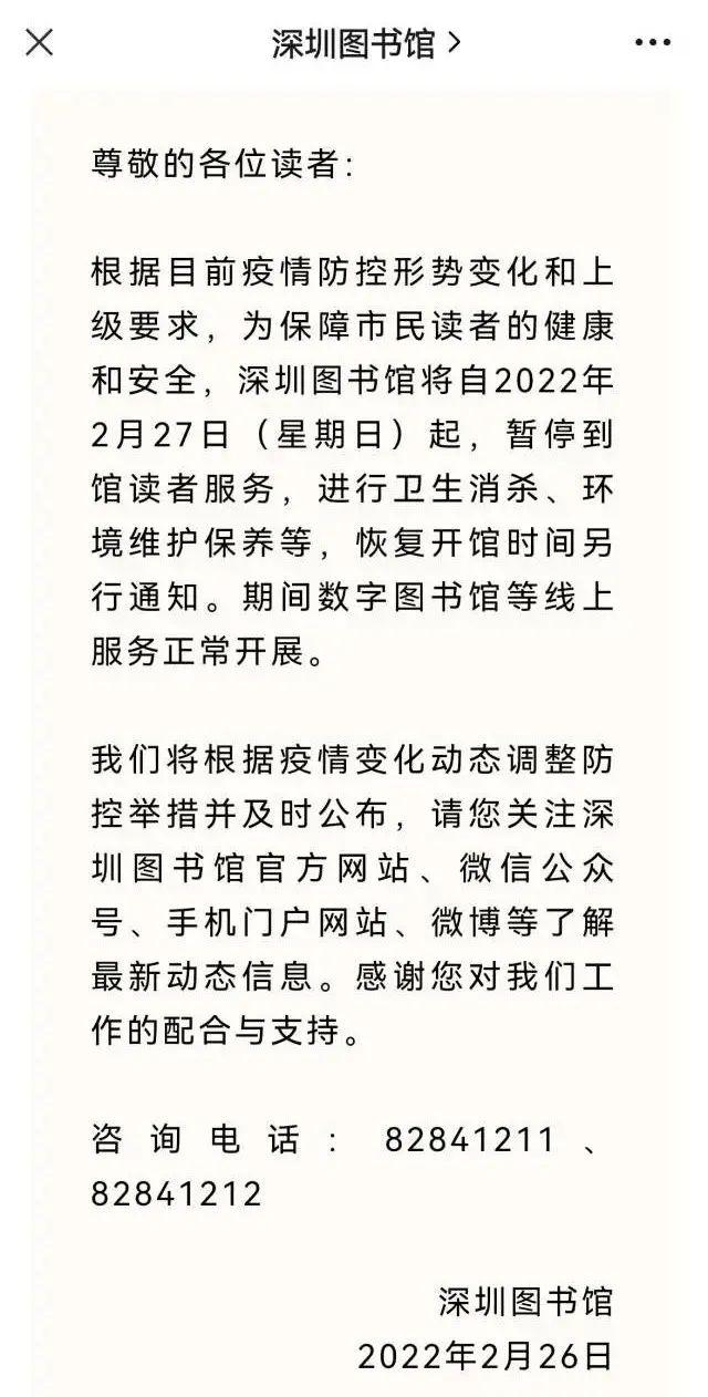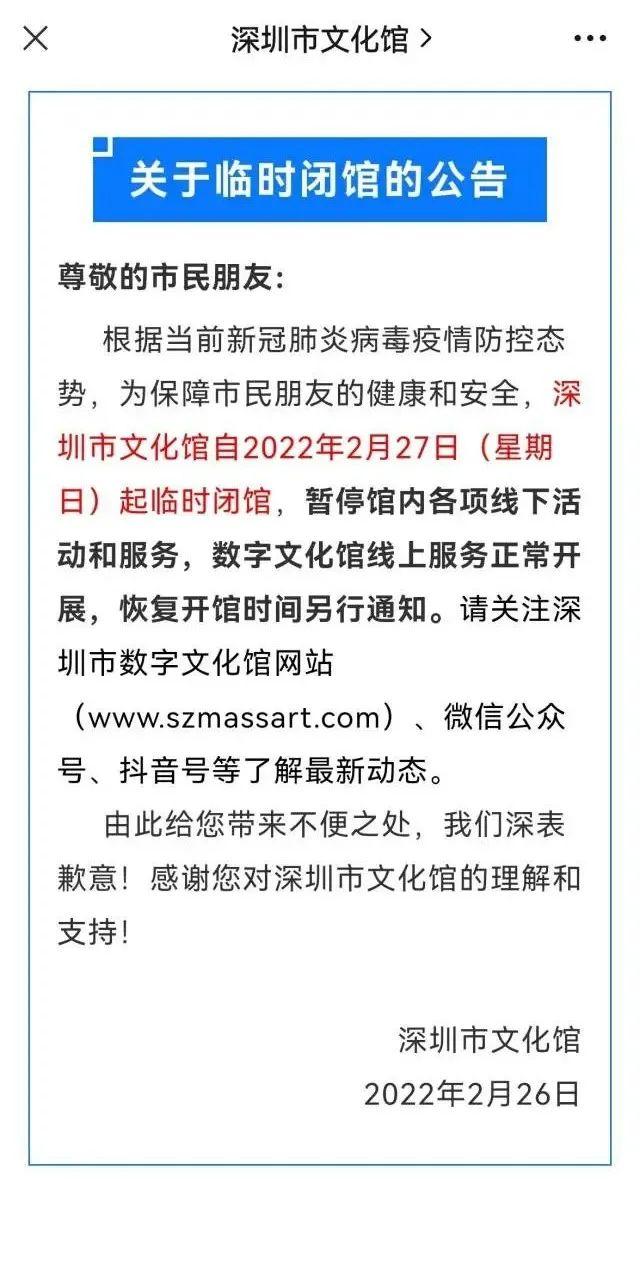2月26日晚间,深圳图书馆、深圳博物馆、深圳市文化馆、深圳少年儿童图书馆等多个文化场馆发布临时闭馆公告。