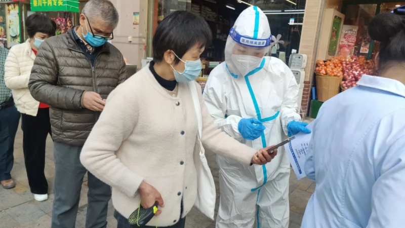 协助现场扫码、测温,查验居民健康绿码,提醒居民戴口罩、保持一米距离。
