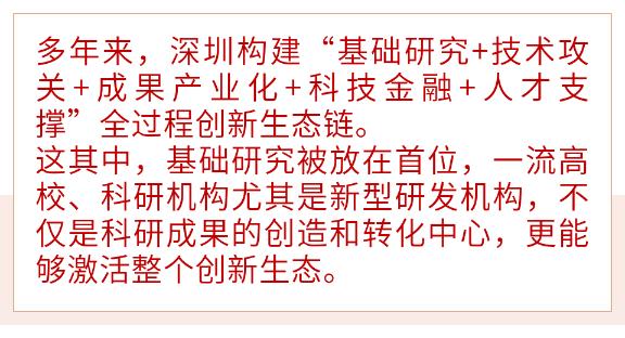 “在南中国,煲一锅创新驱动增长的浓汤”,著名经济学家周其仁曾以“浓汤”谈要素互动:让人才、公司、大学、法律服务、金融力量等创新要素,在大湾区的沃土持续性地充分互动。在深圳高新区,一批高水平科研中心、新型研发机构正是这锅“浓汤”中的关键成分,汇聚战略科技力量,提升源头创新能力,调动各种人才积极互动、碰撞和挑战,激活产业创新生态。