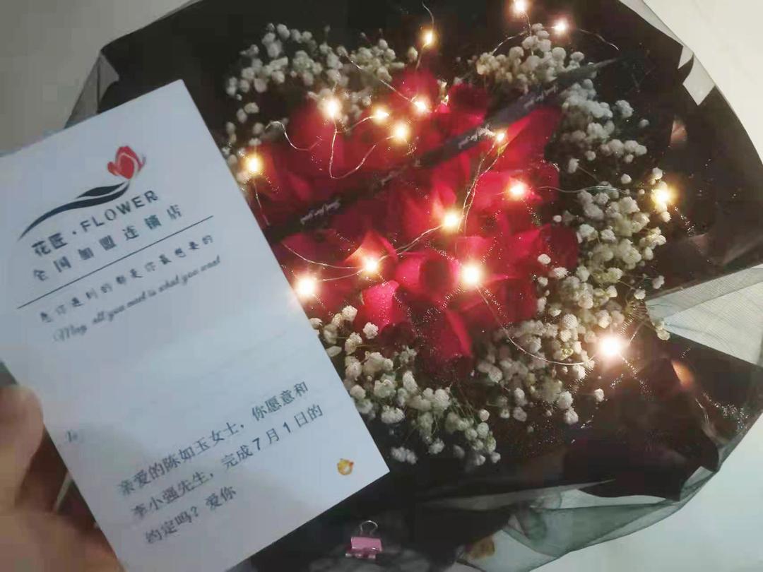 为了帮助李小强解决生活上的烦恼,专班决定立刻行动,当天晚上便预订了一束代表爱情的玫瑰花,卡片上的文字由李小强自主决定,鲜花则由专班的同事代替李小强送至其女友手上,并全程通过手机视频,大家在线上共同见证这一温暖而浪漫的仪式,并为他们送上了真挚的祝福。